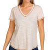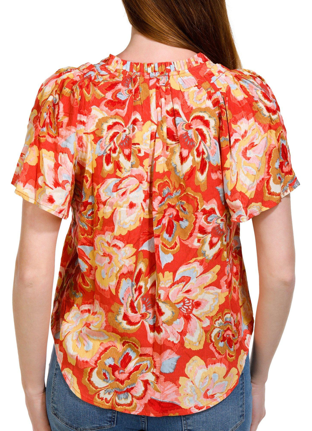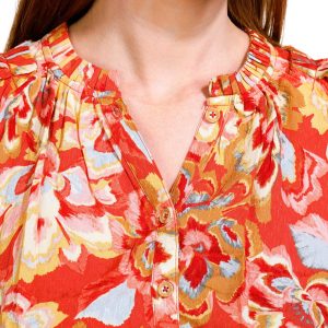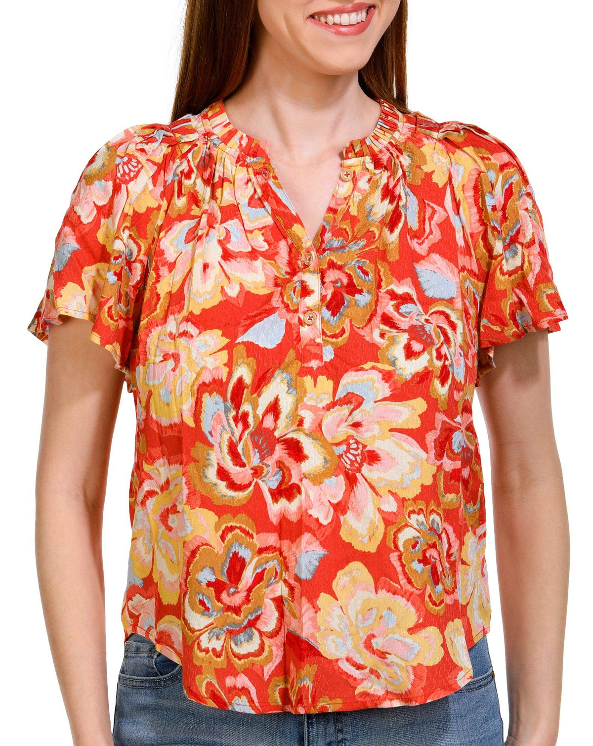 With this flowing floral printed woven top, springtime is wherever you are. Feminine accents, like a ruffle edge V-neck, half button down placket, and short bell sleeves with ruffle shoulders, elevate and effortlessly polish your outfit. Top length measures approximately 24.5 in.