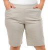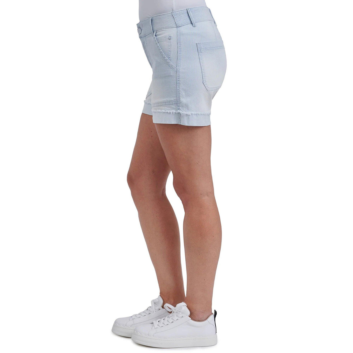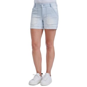 These Democracy denim shorts feature a solid color design on lightweight denim fabric, a stretch waistband, Ab-tech tummy control, one-button and zipper closure, five-pocket styling, and a roll cuff hem. The unrolled inseam measures approximately 4 in. Fabrication is 97% cotton and 3% spandex.