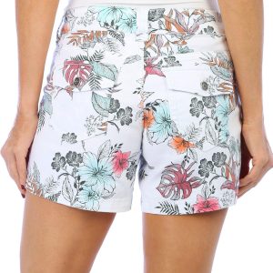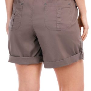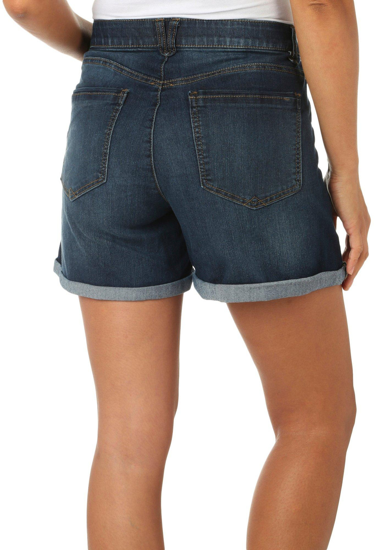 These Democracy denim shorts feature a whiskered design on lightweight denim fabric, a stretch waistband, Ab-tech tummy control, one-button and zipper closure, five-pocket styling, and a roll cuff hem. The unrolled inseam measures approximately 7 in. Fabrication 54% cotton, 27% rayon, 17% polyester, 2% spandex.