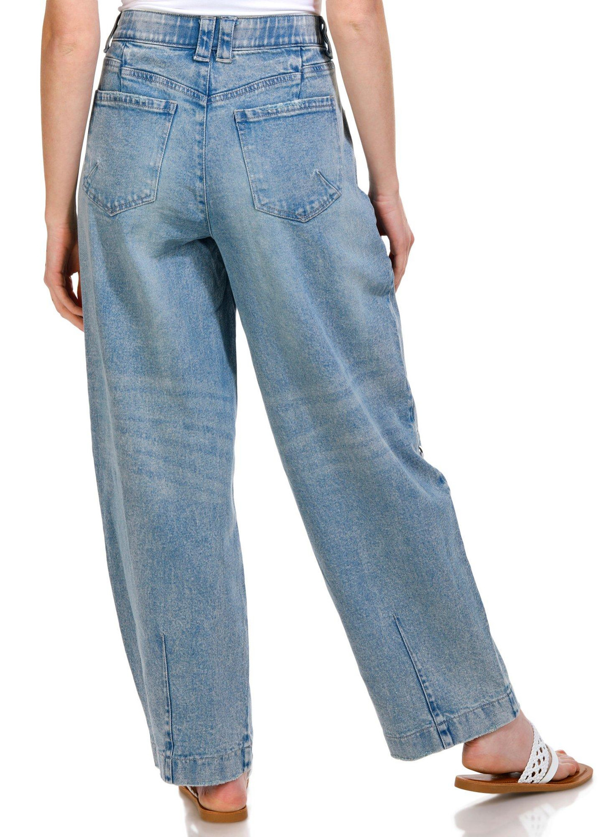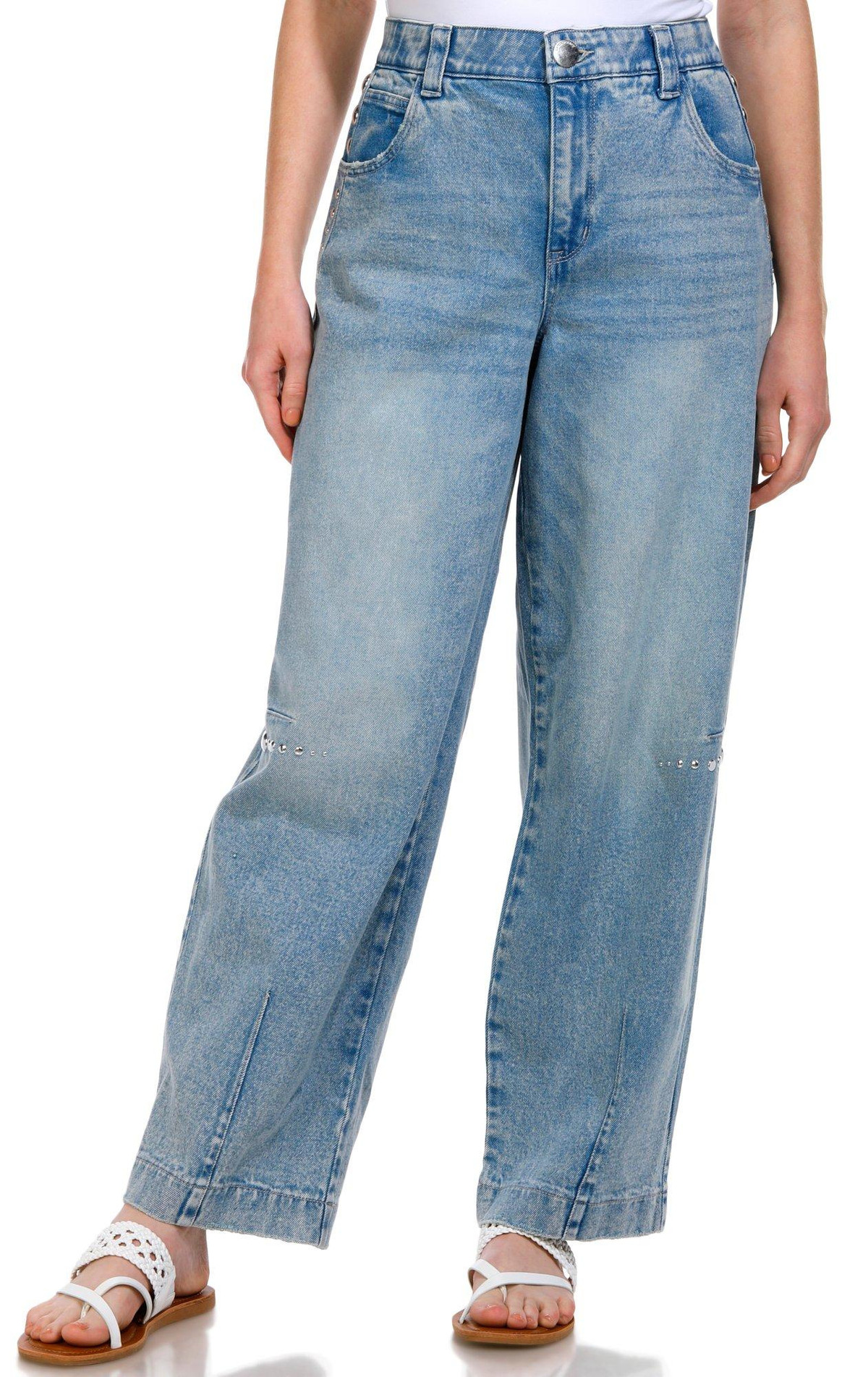 Slip into these Ab-solution® relaxed Barrel Leg jeans to elevate your weekend wear. Theyre designed with on-trend details like a skyrise waist, whiskering and subtle destruction at the pockets, silver studs with seaming, and a broken V-shaped back yoke. Fabrication is 98% cotton, 2% spandex.