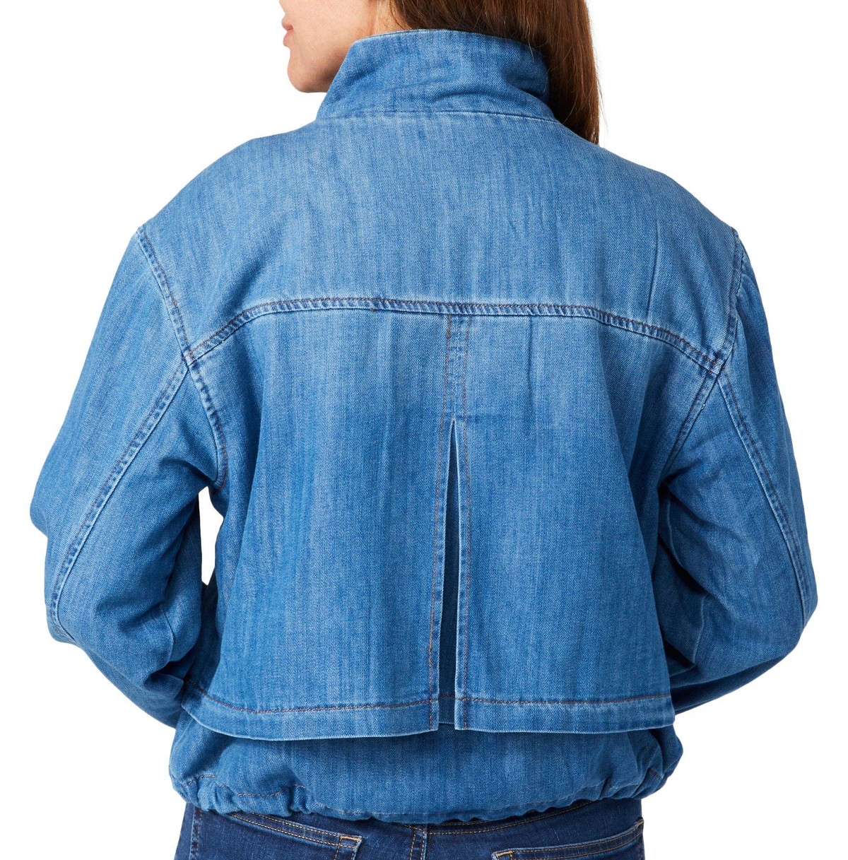 Layer up into spring in this zip front jacket, designed with long snap sleeves, a high neck, angled chest pockets, back vent, and a double layer design. Its soft, drapey denim provides a timeless, cool vibe wherever you go. Top length measures approximately 23 in. Fabrication is 63% cotton, 26% polyester, 11% rayon.