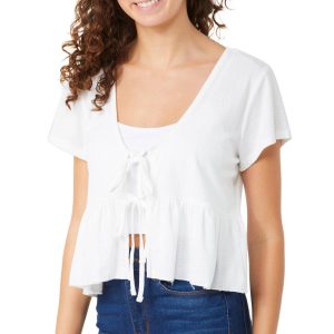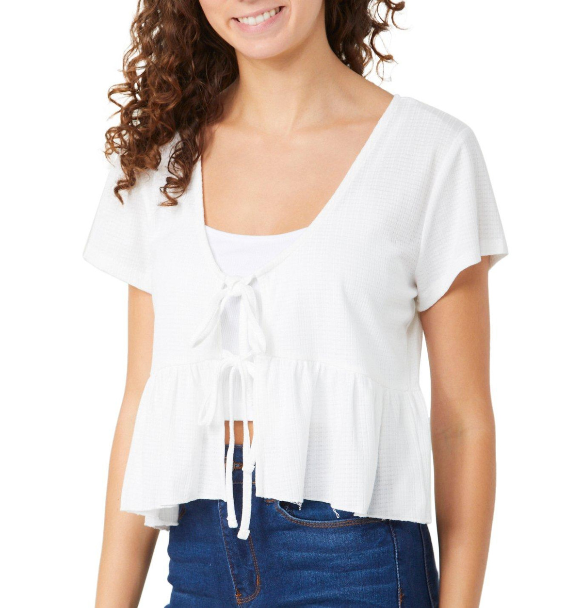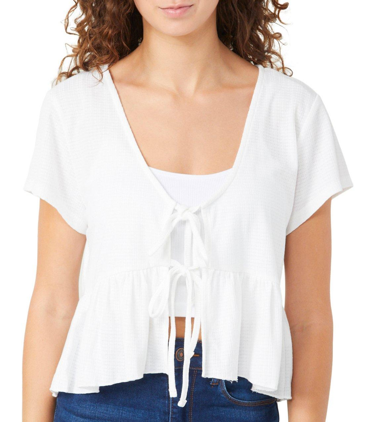 Introducing the Double Tie Front Top from Discreet. This top features a stylish solid color and double tie front that offers an adjustable fit while creating a flattering silhouette. Perfect for any casual or semi-formal occasion, this top combines fashion and versatility effortlessly. Fabrication is 93% polyester, 7% spandex.