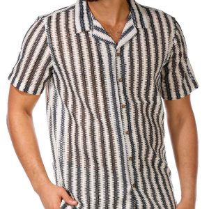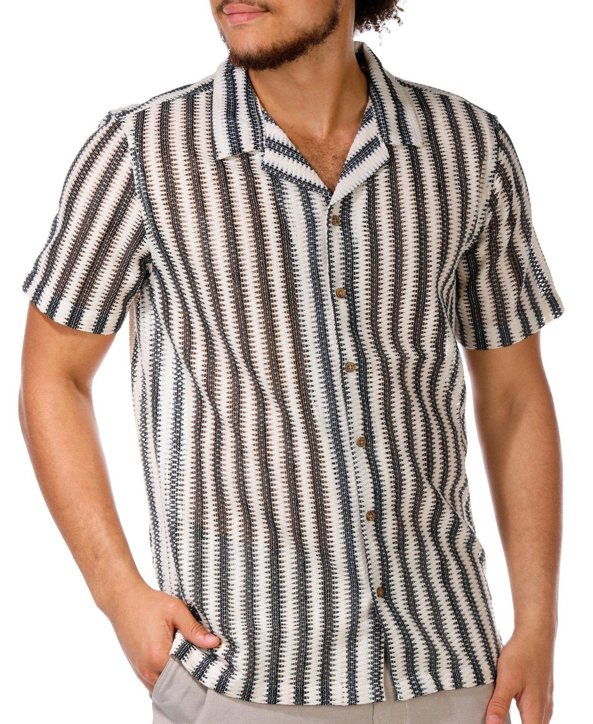 Keep it cool and classic with a striped short sleeve shirt featuring an open weave for extra breathability. The buttoned front adds a timeless touch, making it ideal for warm-weather days, laid-back outings, or effortless layering. Fabrication is 65% polyester, 35% cotton.