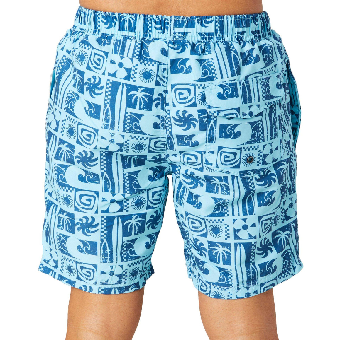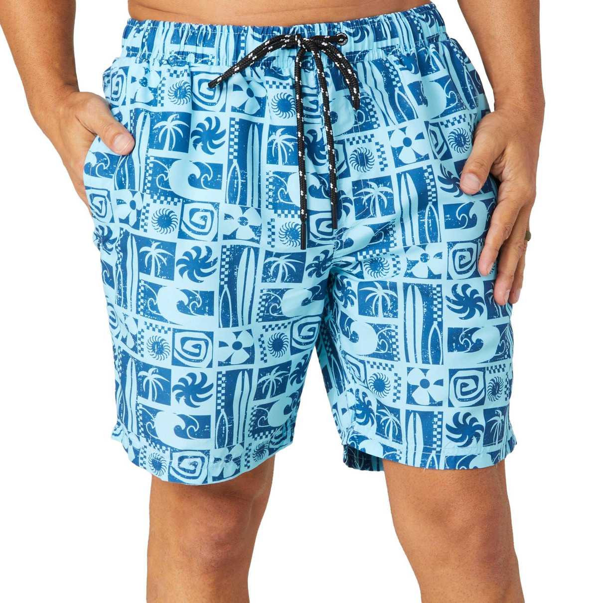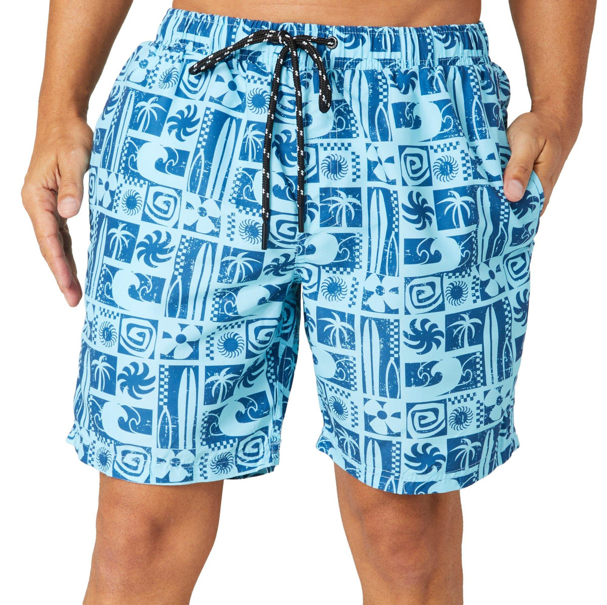 Stay protected and stylish with these Tropical Blue 7 in. Swim Trunks from Distortion, featuring built-in sun protection and a drawstring waist for a perfect fit. The built-in liner ensures comfort and support, making these trunks ideal for active days at the beach or pool. They have two side pockets and one back pocket to hold your necessities. Crafted from quick-dry materials, they offer both durability and a sleek look. Inseam measures approximately 7 in. Fabrication is 100% polyester.