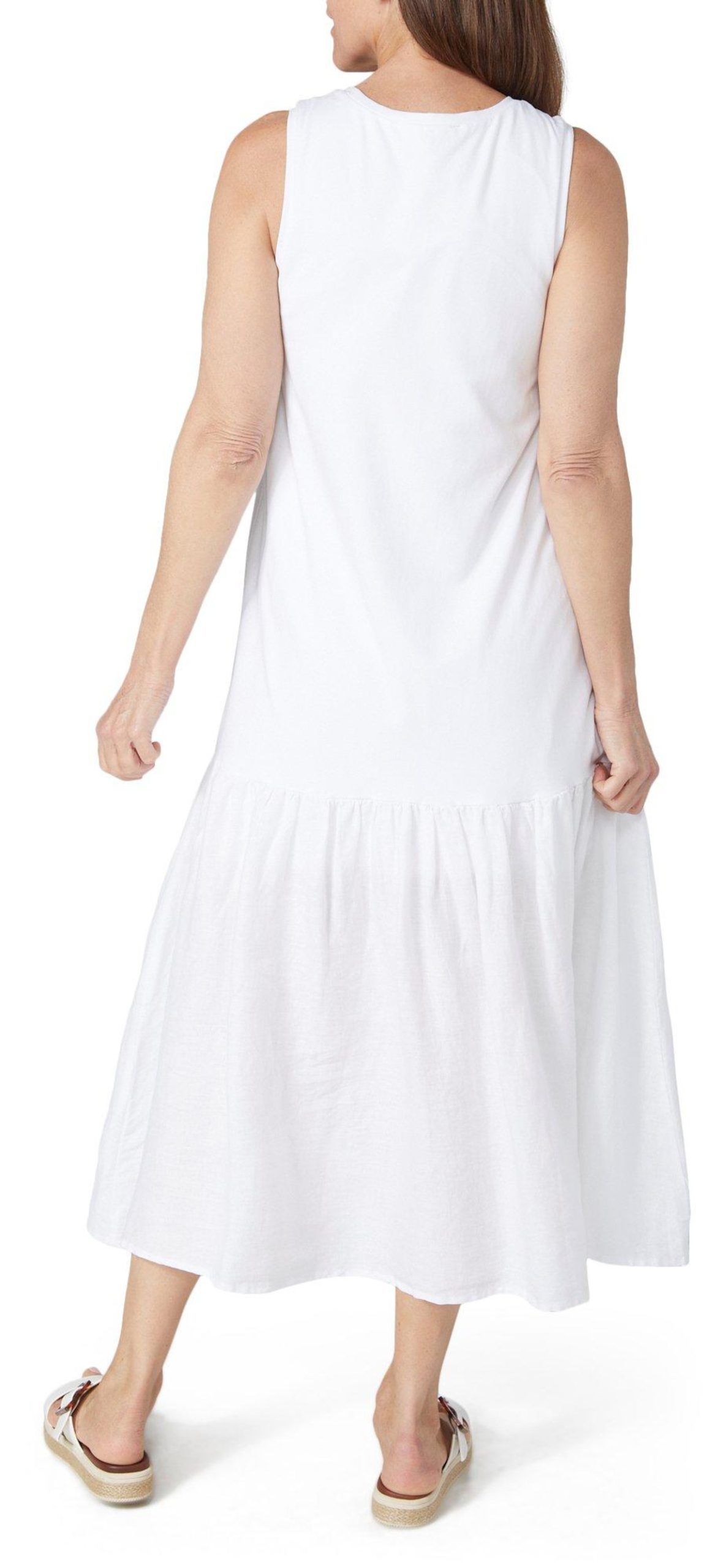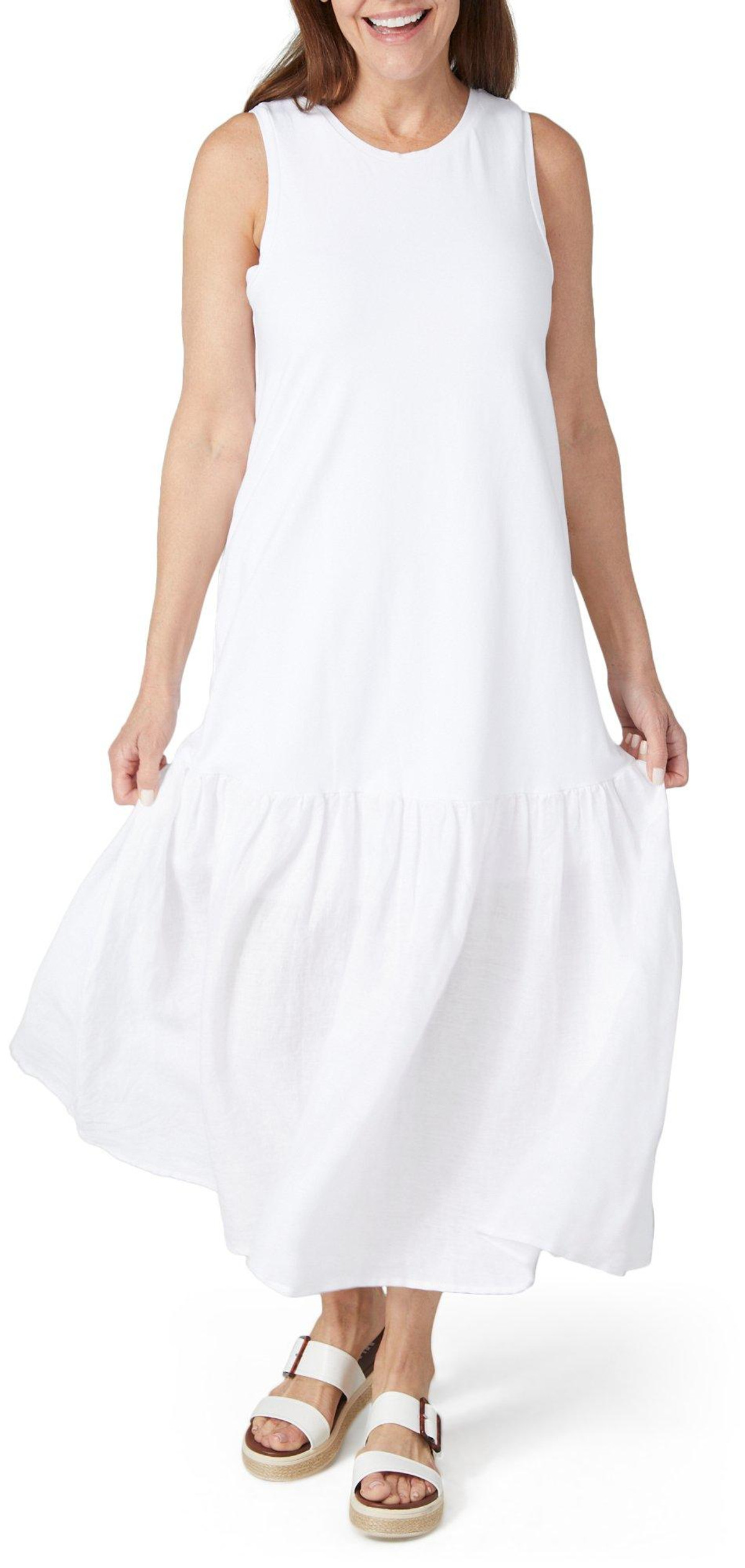 The Sleeveless Knit Solid Printed Dress is a perfect mix of comfort and style. Featuring a soft, stretchy cotton-spandex blend on the top tier and a lightweight printed linen lower tier, it offers a flattering fit with breezy movement. Ideal for warm days, this dress brings effortless charm to any casual outing.