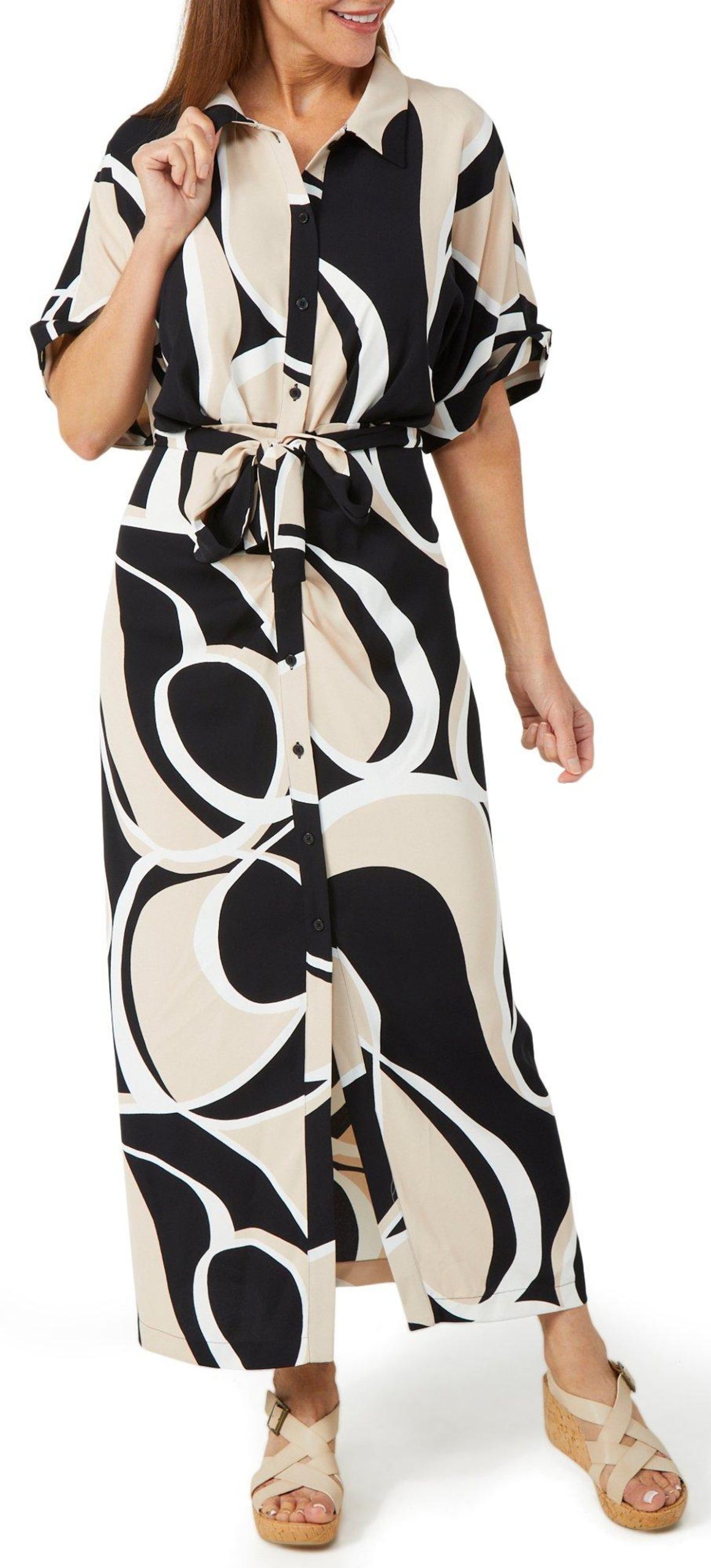 This womens short sleeve dress is made of 100% polyester and features a stylish print with a button down front and waist tie. Designed for comfort and charm, it offers a flattering fit and versatile look perfect for casual days or dressed up evenings.