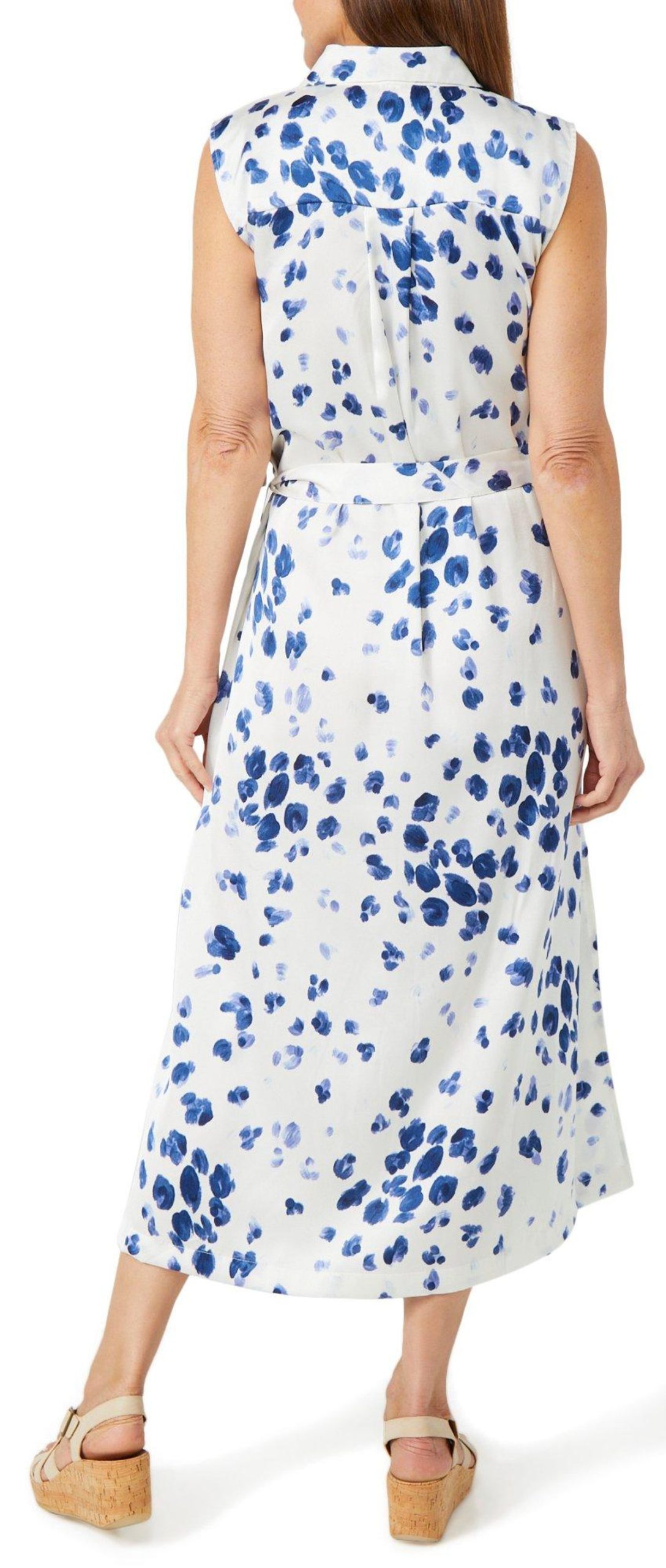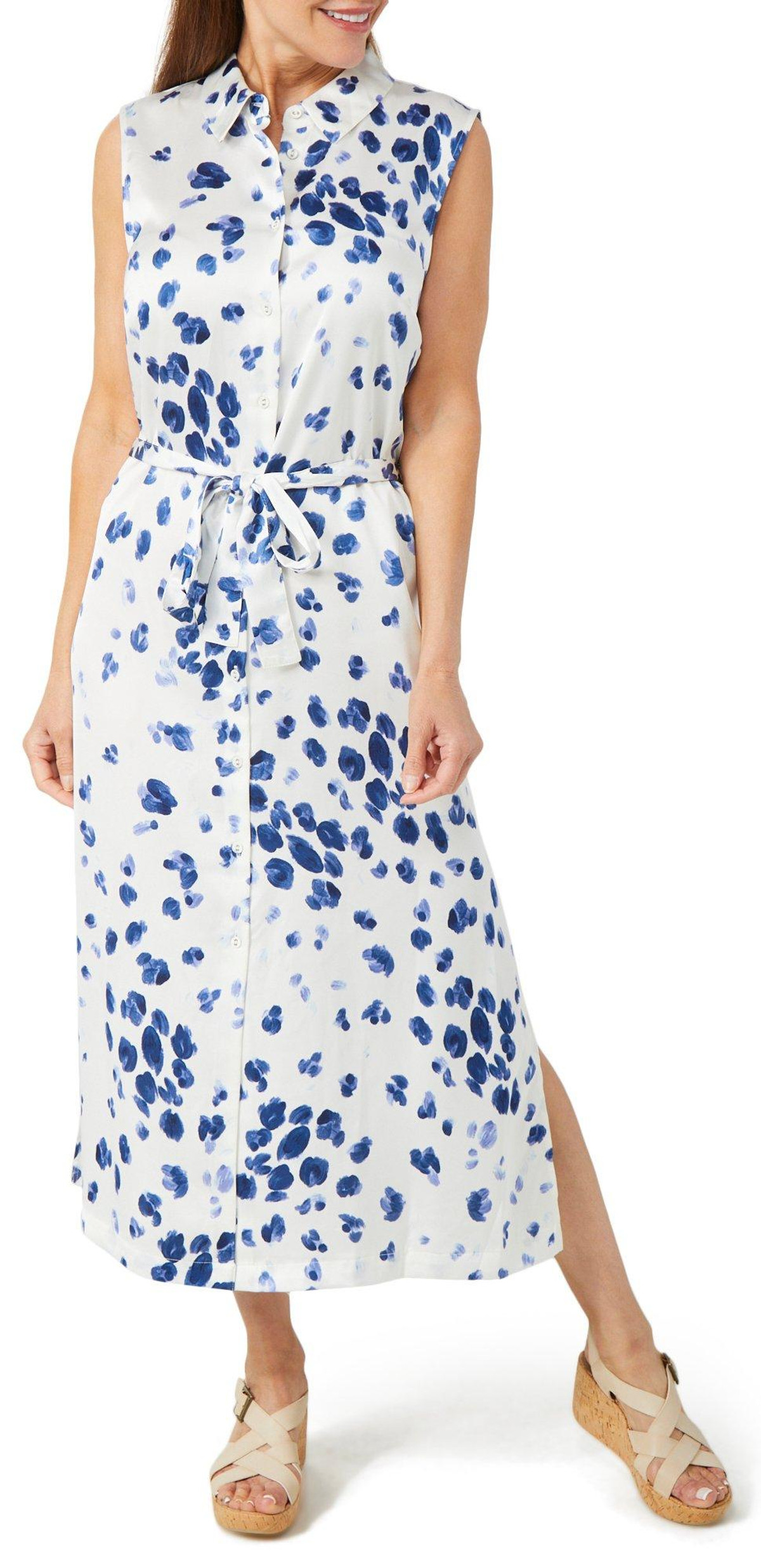 This womens sleeveless dress is made of 100% polyester and features a charming dotted print with a button down front and waist tie. Light and flattering, it is perfect for sunny days and casual outings.