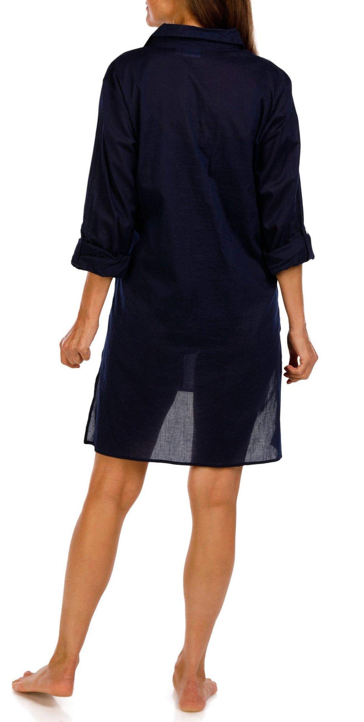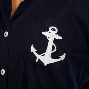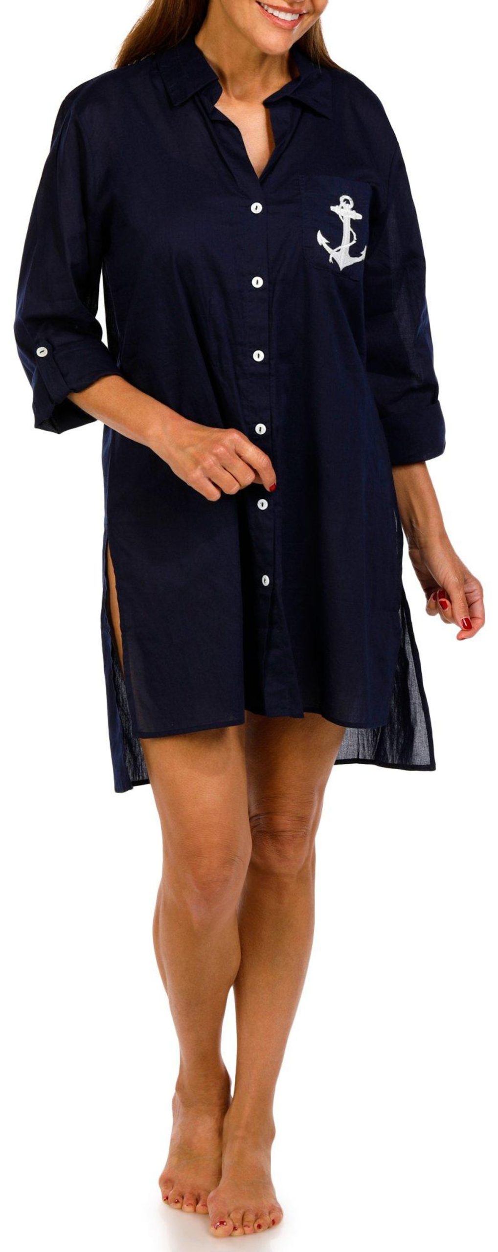 Brighten beach days with a breezy 3/4 sleeve button-down cover-up, crafted from lightweight sheer cotton for effortless layering. Roll-tab cuffed sleeves and an embroidered anchor on the chest add coastal charm and subtle sophistication. Perfect for tossing over swimwear, it offers just the right coverage while keeping your look cool, airy, and sun-ready. Fabrication is 100% cotton. Measures approximately 33 in length.