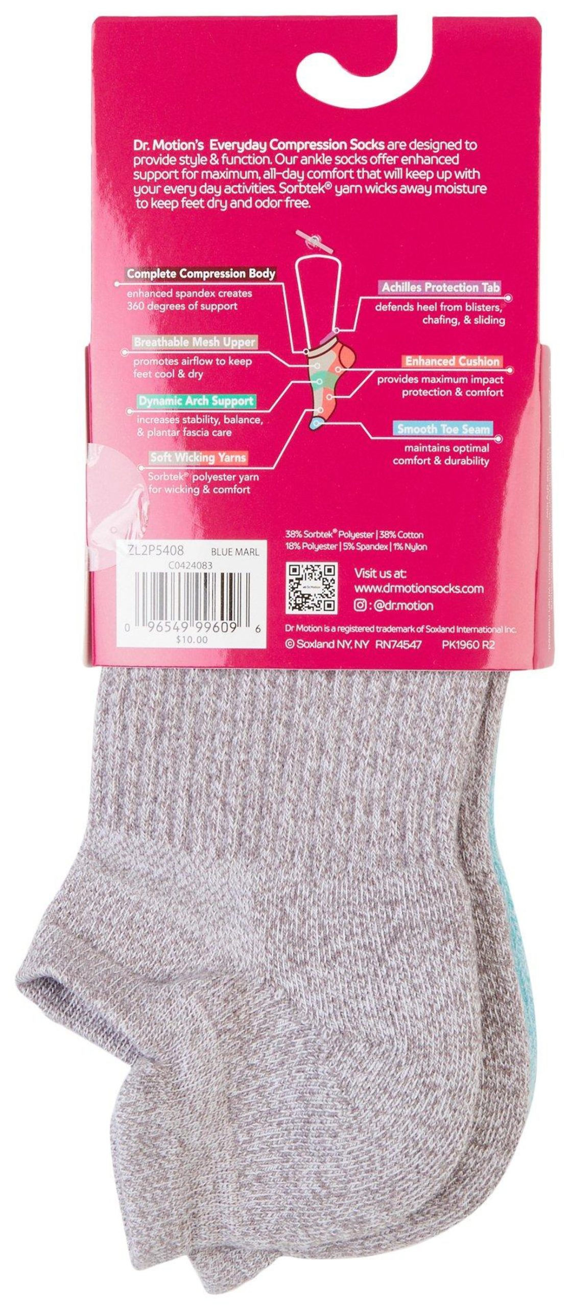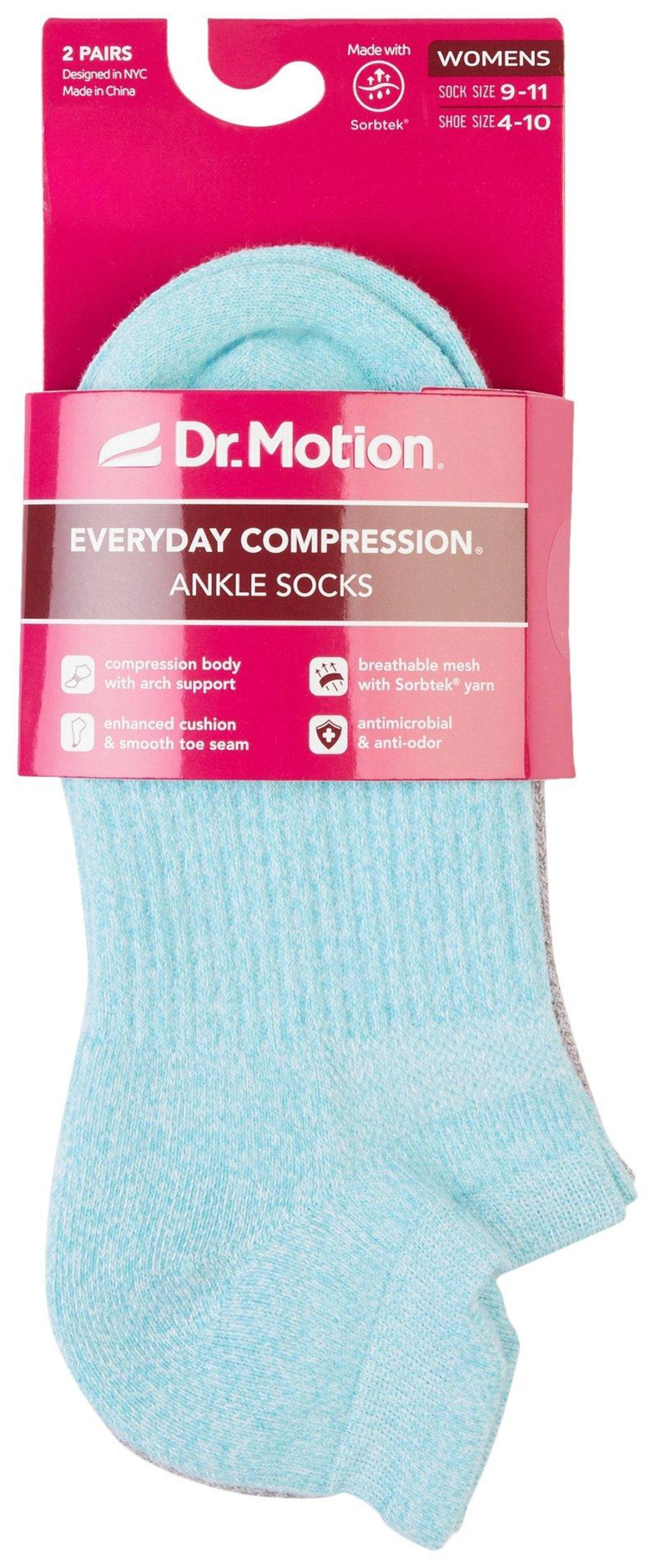 Support and comfort your feet with this 2 Pk Compression Ankle Socks. Designed with a compression body, dynamic arch support, and enhanced cushioning, they help reduce fatigue while providing a secure fit. Breathable mesh and Sorbtek yarn manage moisture, while antimicrobial and anti-odor properties keep feet fresh. Ideal for all-day wear, work, or active routines. Sized for womens sock size 9-11 and shoe size 4-10.