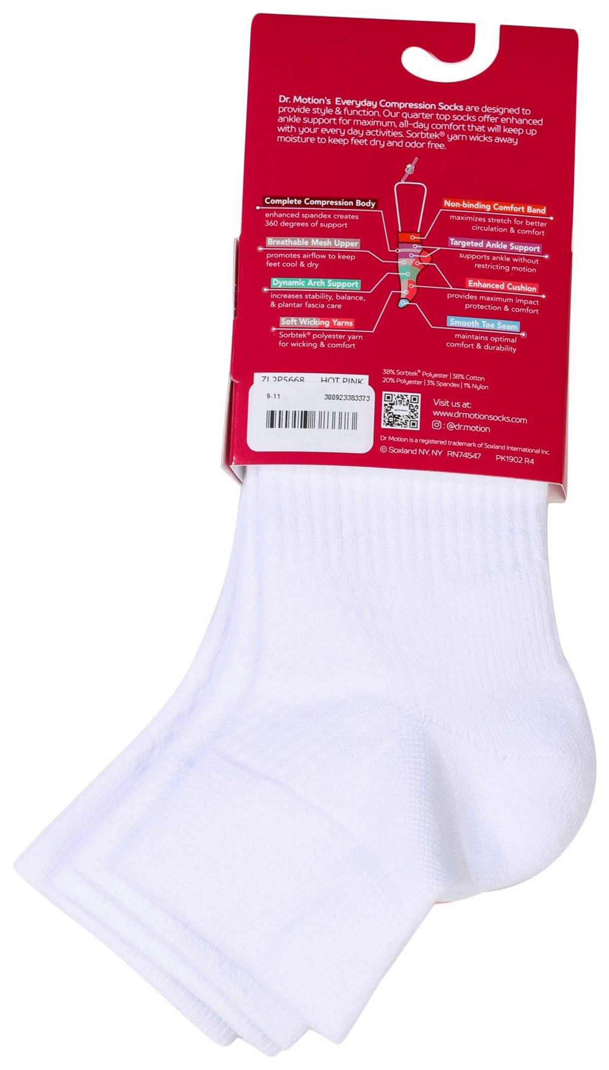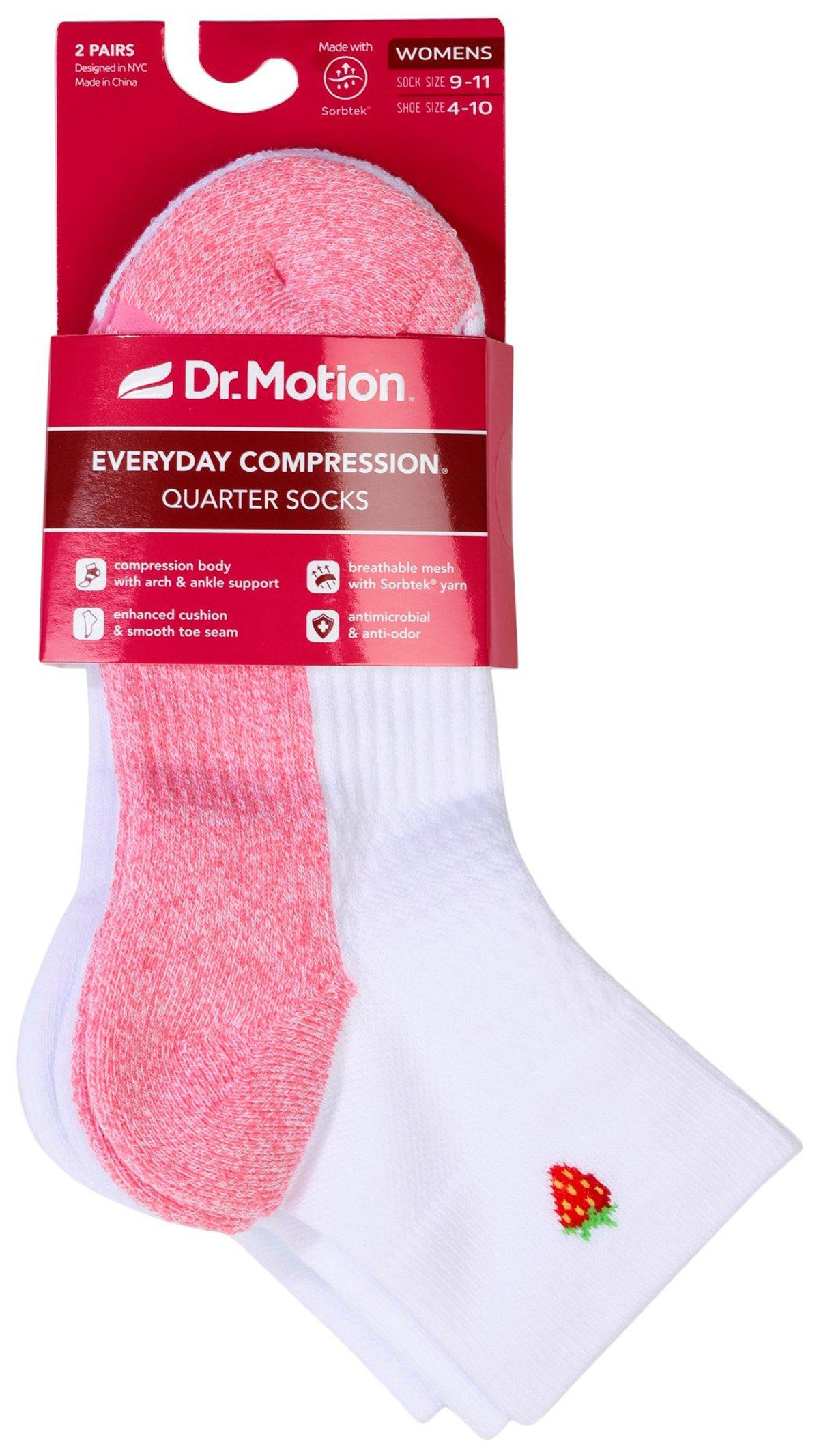 Support daily comfort with this Womens 2 Pk Everyday Compression Quarter Socks, featuring a compression body with arch and ankle support, breathable mesh with Sorbtek yarn, and enhanced cushioning. Designed with a smooth toe seam, antimicrobial properties, and a strawberry embroidery on the ankle. Ideal for all-day wear and active routines. Fabrication is: 38% Sorbtek Polyester, 38% cotton, 20% polyester, 3% spandex.