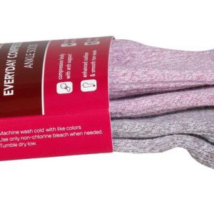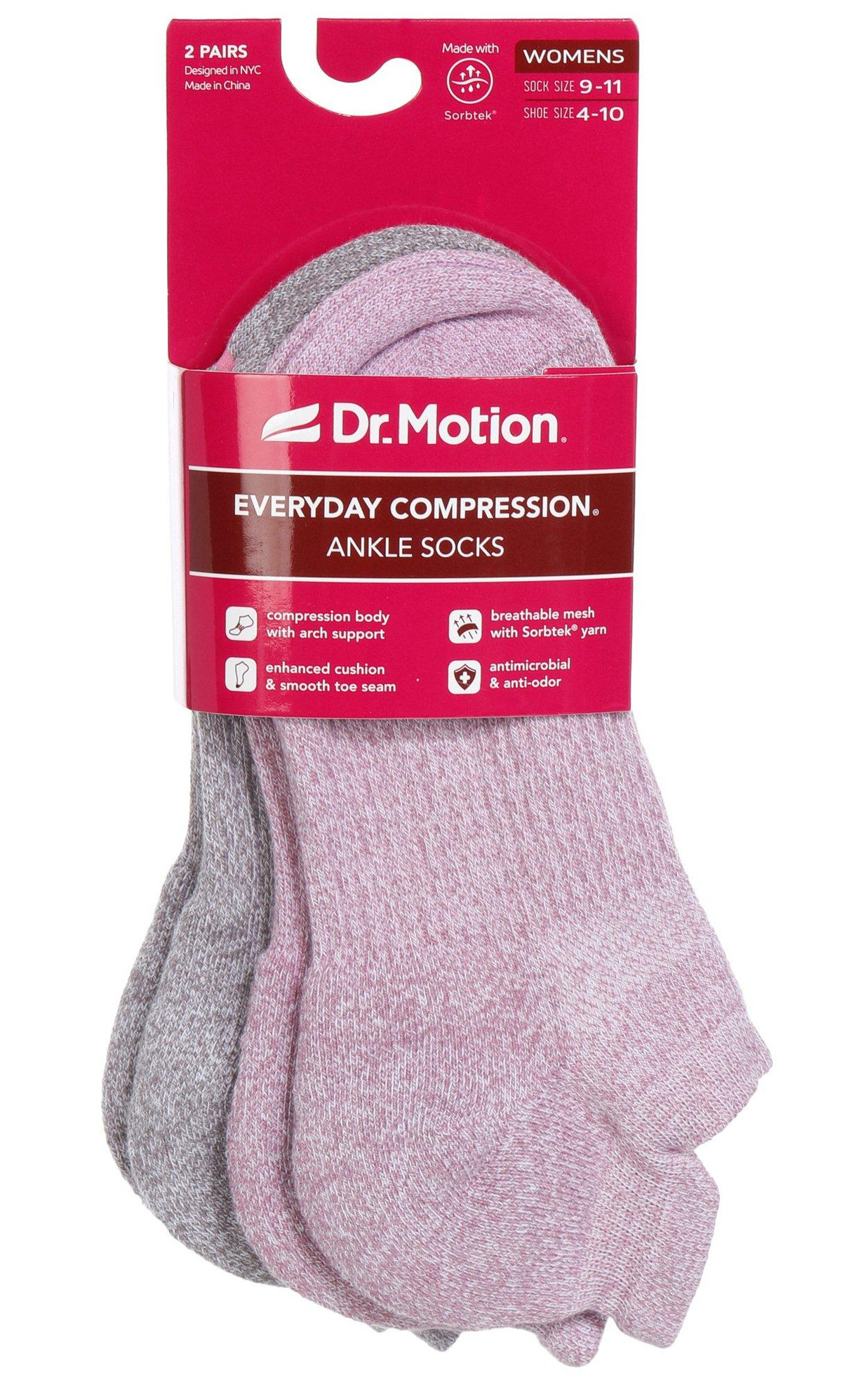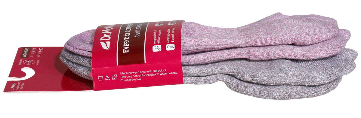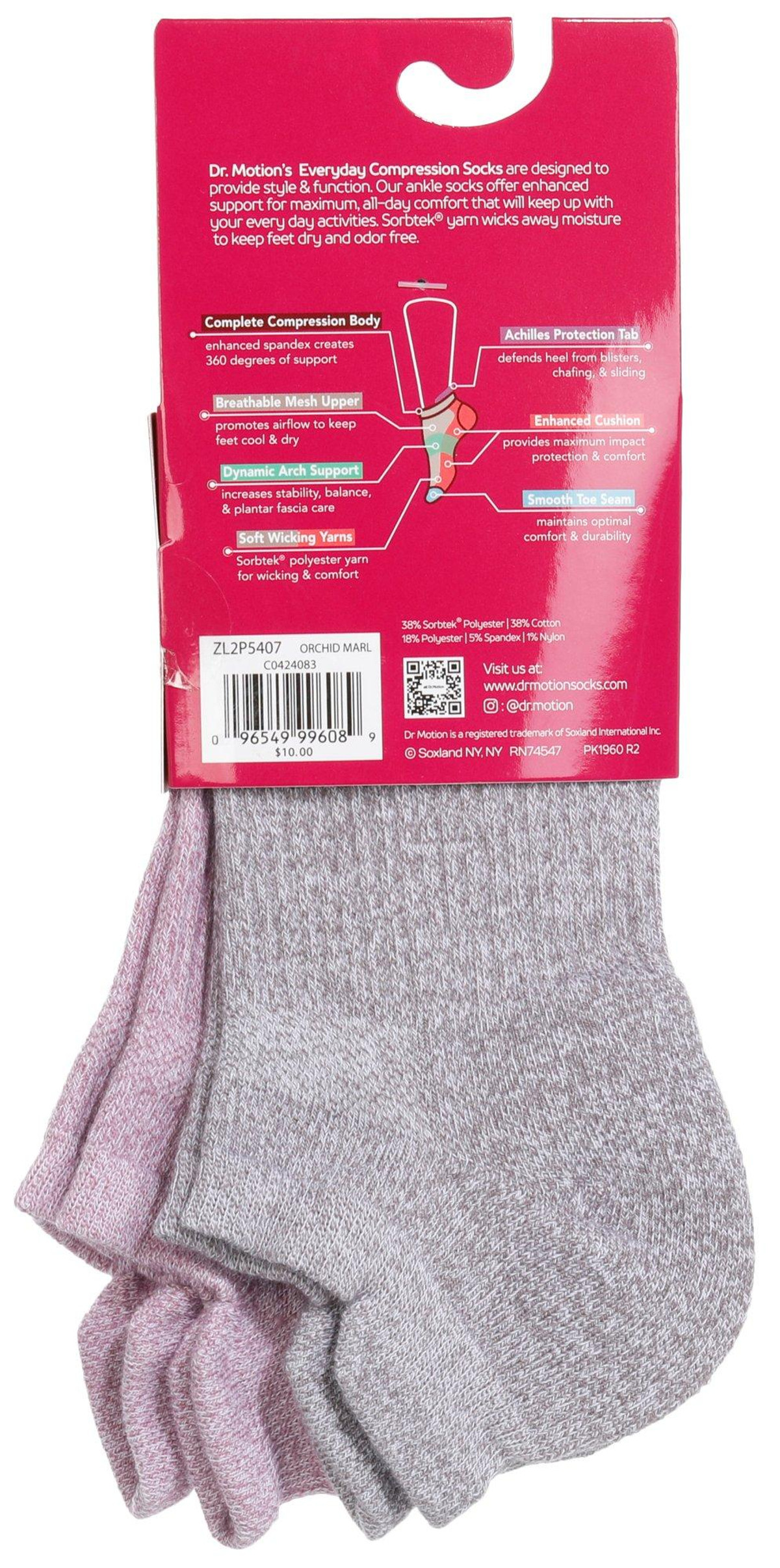 Dr. Motion women’s compression ankle socks come in a 2-pair pack featuring a fresh orchid color design. Sized 911 sock and 410 shoe. Features include 360° compression, arch support, breathable mesh with wicking yarn, antimicrobial and anti-odor tech, ankle tabs with reflective logo, Y-heel fit, cushioned cotton heel/toe, and reinforced smooth toe. Fabric: 50% Nylon, 29% Cotton, 13% Polyester, 8% Spandex.