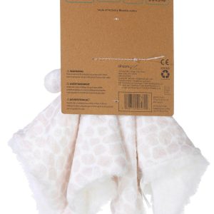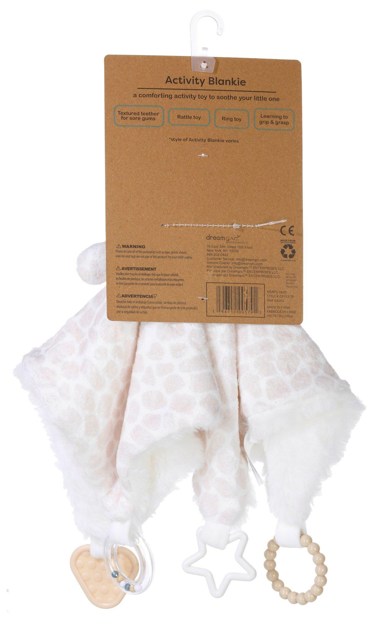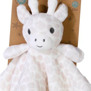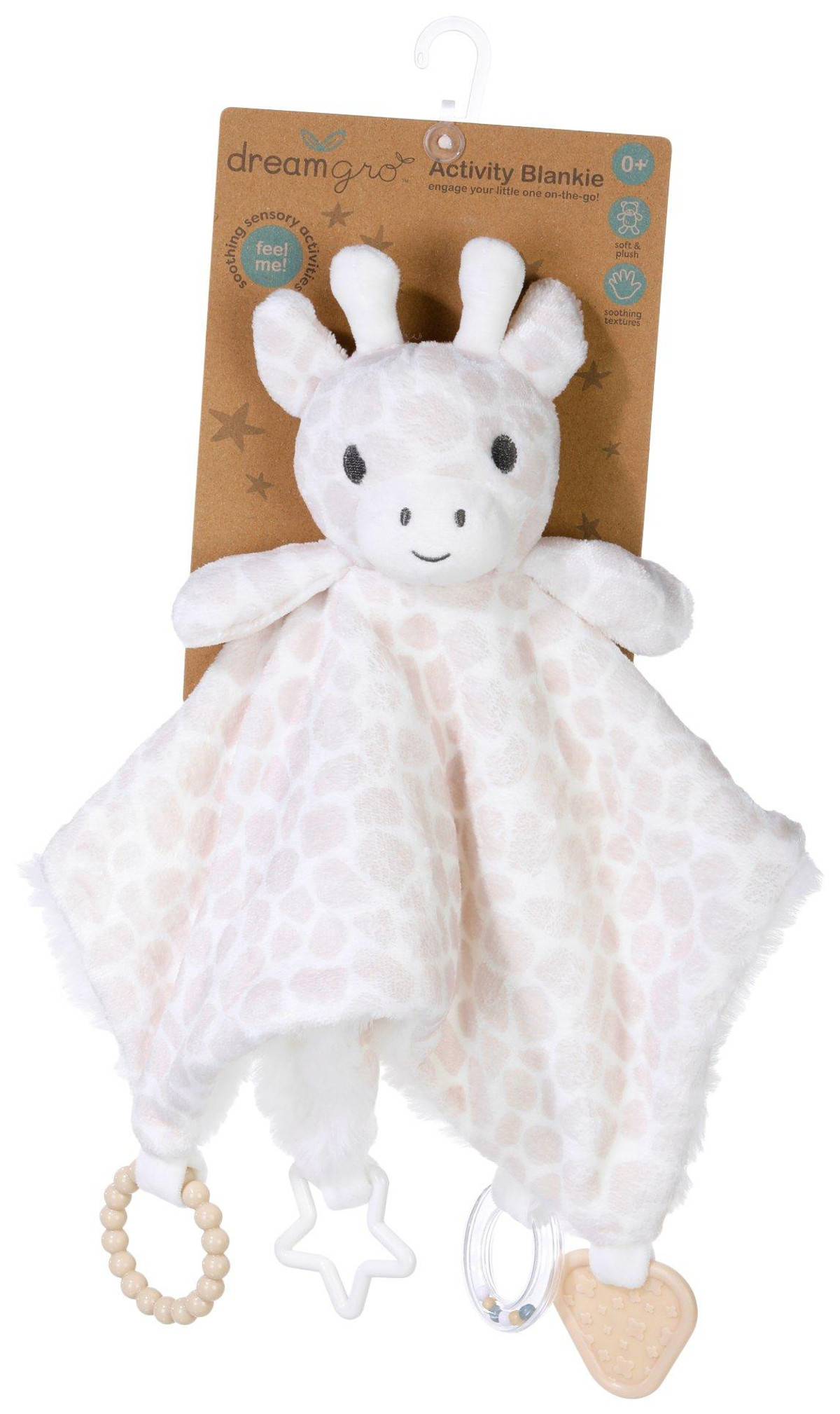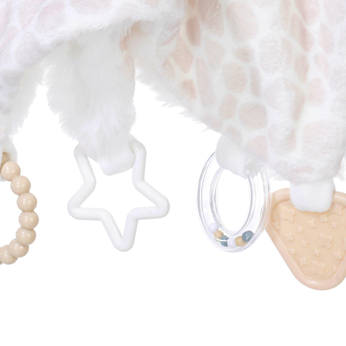 This 15-inch giraffe activity blankie is designed to engage and soothe babies through multiple sensory features. It includes a soft plush body with a built-in rattle, a textured teether for sore gums, and a gripping ring to encourage tactile exploration. Ideal for teething and sensory development, this cuddly companion supports early motor skills while providing comfort and entertainment at home or on the go.
