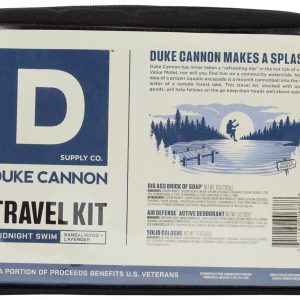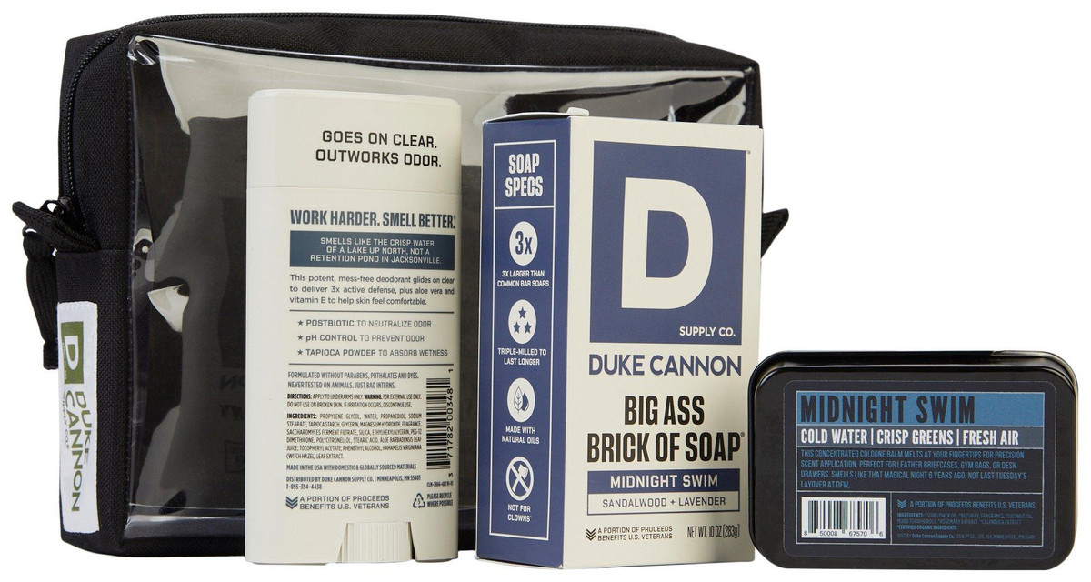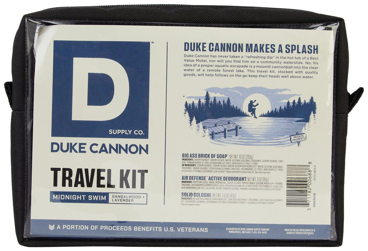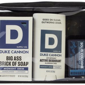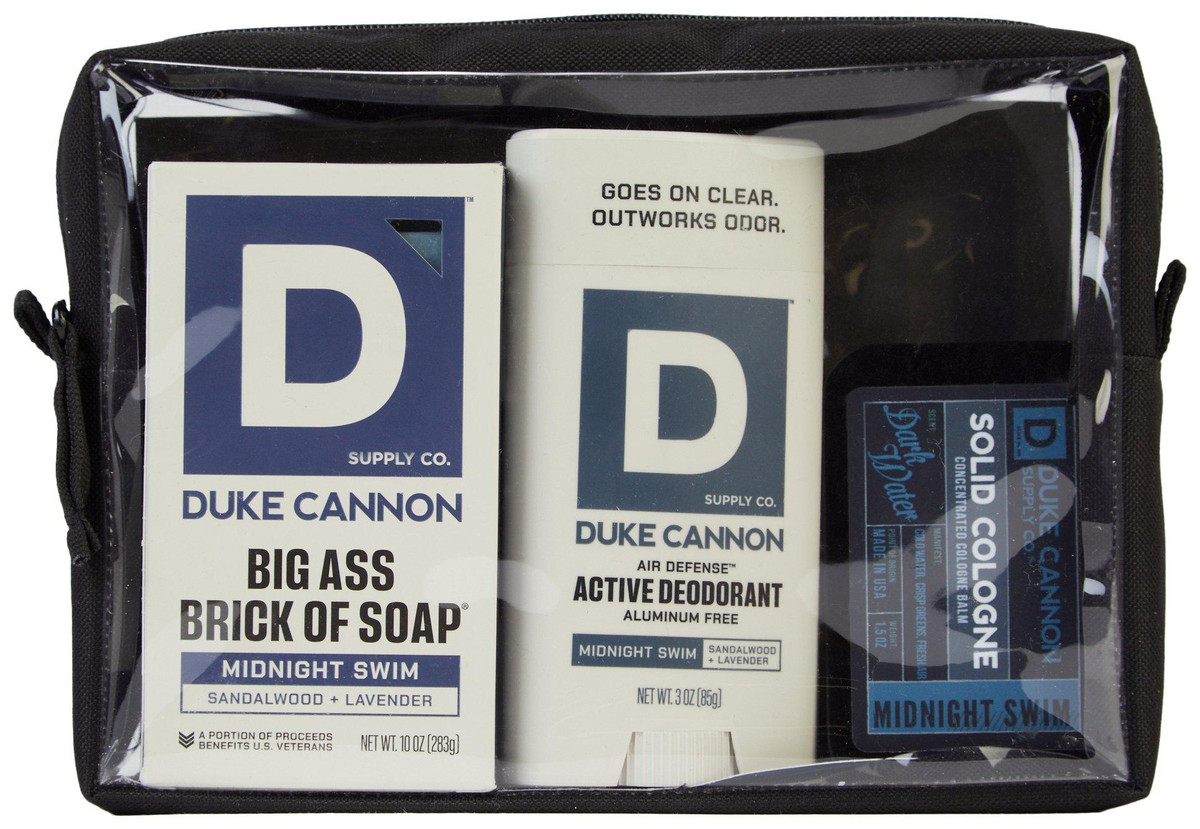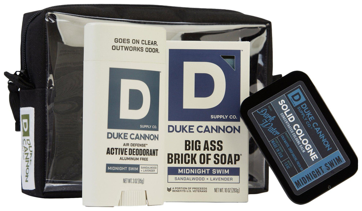 Smell bold and stay fresh with this 4-piece Duke Cannon set, featuring the Big Ass Brick of Soap (10 oz), Midnight Swim cologne (3.5 oz), and aluminum-free Air Defense deodorant (3 oz)all in the crisp Sandalwood & Lavender scent. Packaged in a reusable 6 x 9 clear carrying case, its the perfect gift or on-the-go grooming kit for everyday legends.