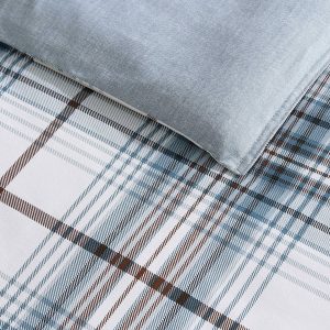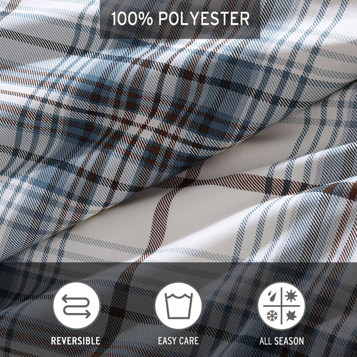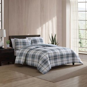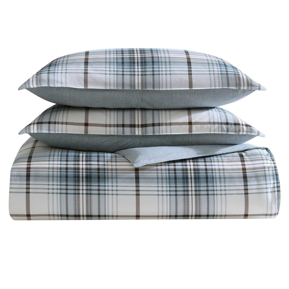 Embrace your outdoor lifestyle with the Eddie Bauer Alder Plaid Comforter Set. The comforter and matching shams feature a plaid pattern, combining rich tones of grey, blue, and brown to create a warm and inviting look. The comforter reverse has a texture print in blue and grey to add some versatility to your bedding ensemble. Great for layering. Machine washable for easy care.
