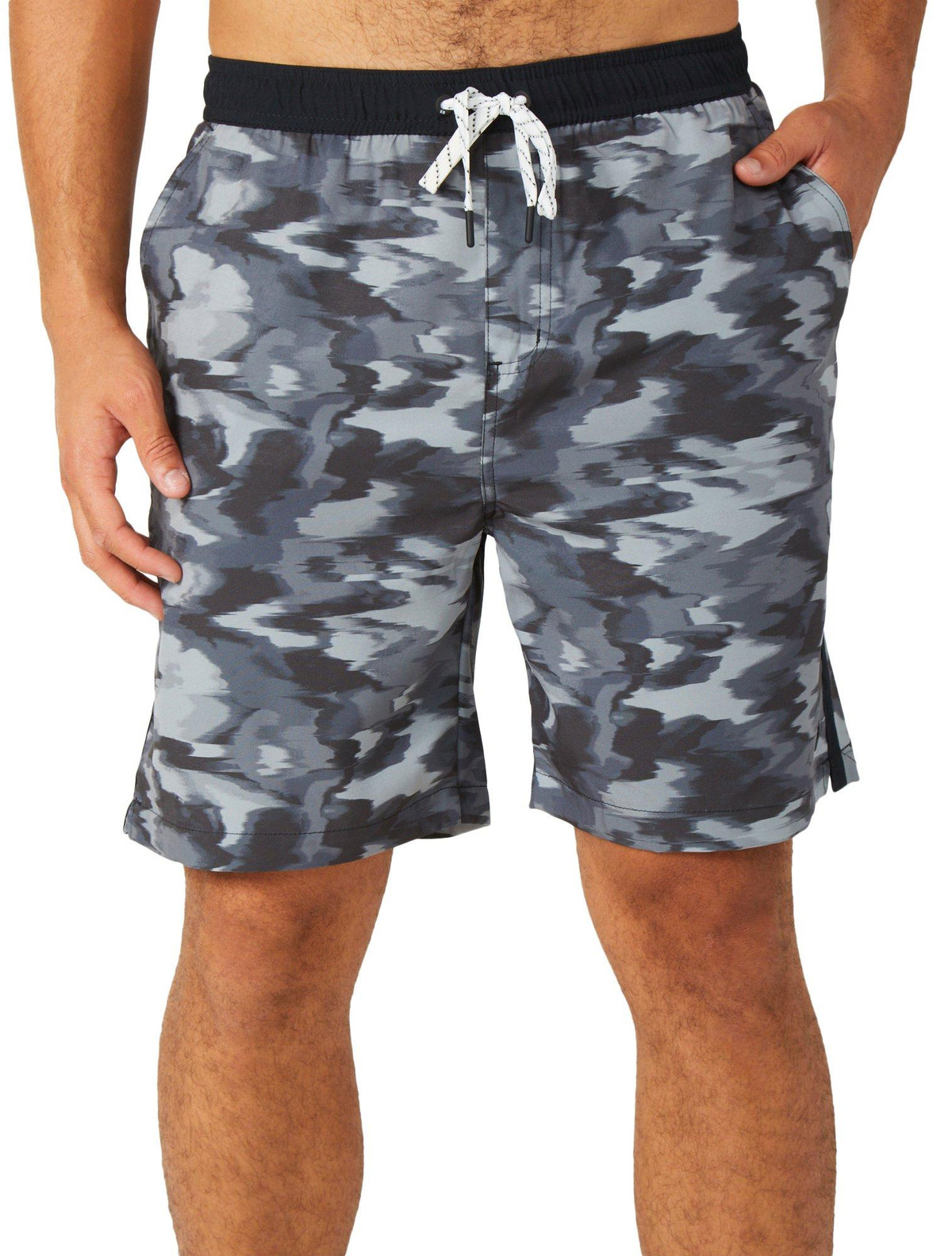 These volley shorts feature a bold camo print with a drawstring waistband for a secure fit. Designed with side seam and back pockets, they offer quick dry fabric and UPF 50 plus protection. Made from a flexible blend of polyester and spandex, they are ideal for active days in the sun.