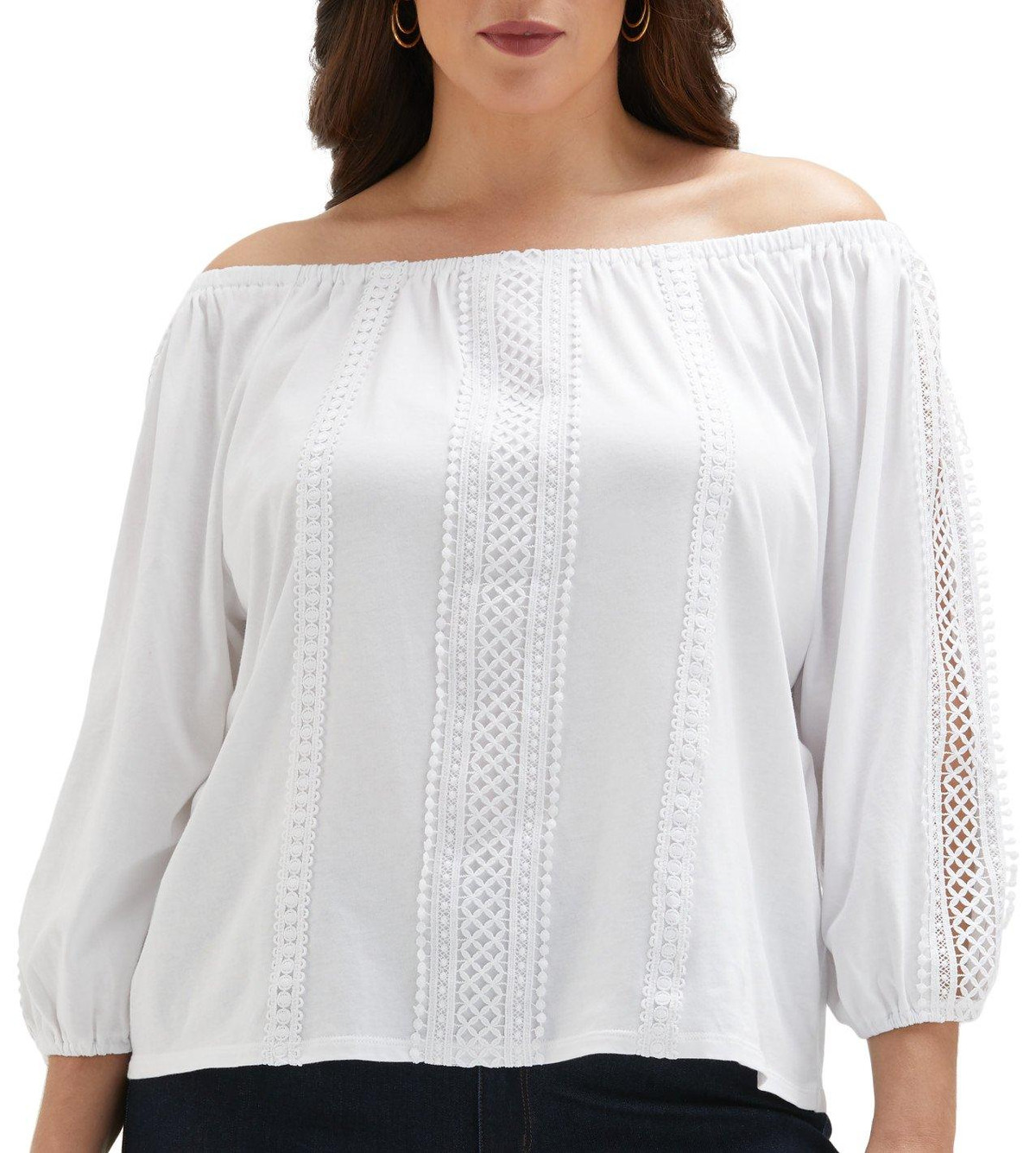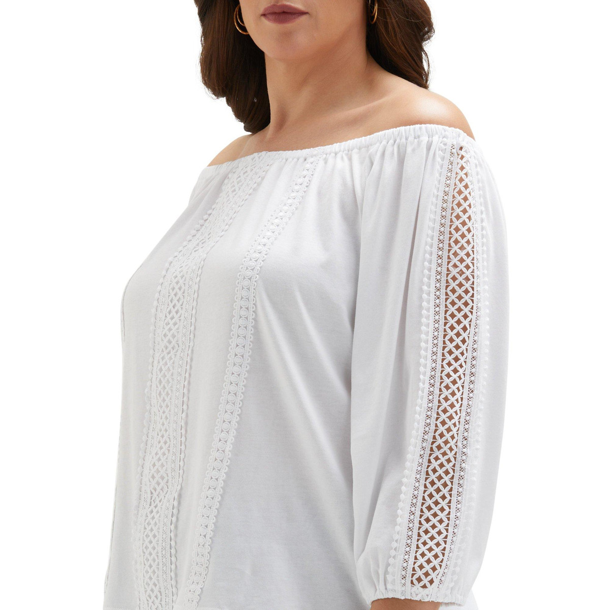 This top features lace trim down the front and see-through lace insets along the sleeves for elegant feminine style. The 3/4 sleeve womens top is crafted from a soft jersey knit fabric thats comfortable to wear in any season or setting. The neckline and sleeves are elasticated, which creates a stylish silhouette and helps provide added comfort. Top length measures approximately 22.5 in.
