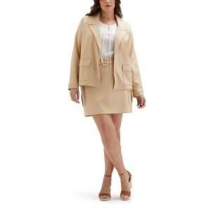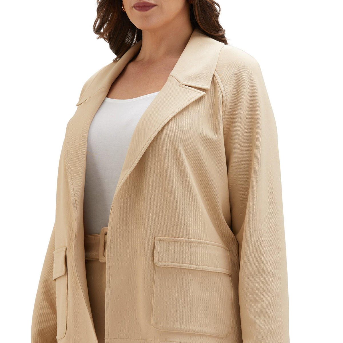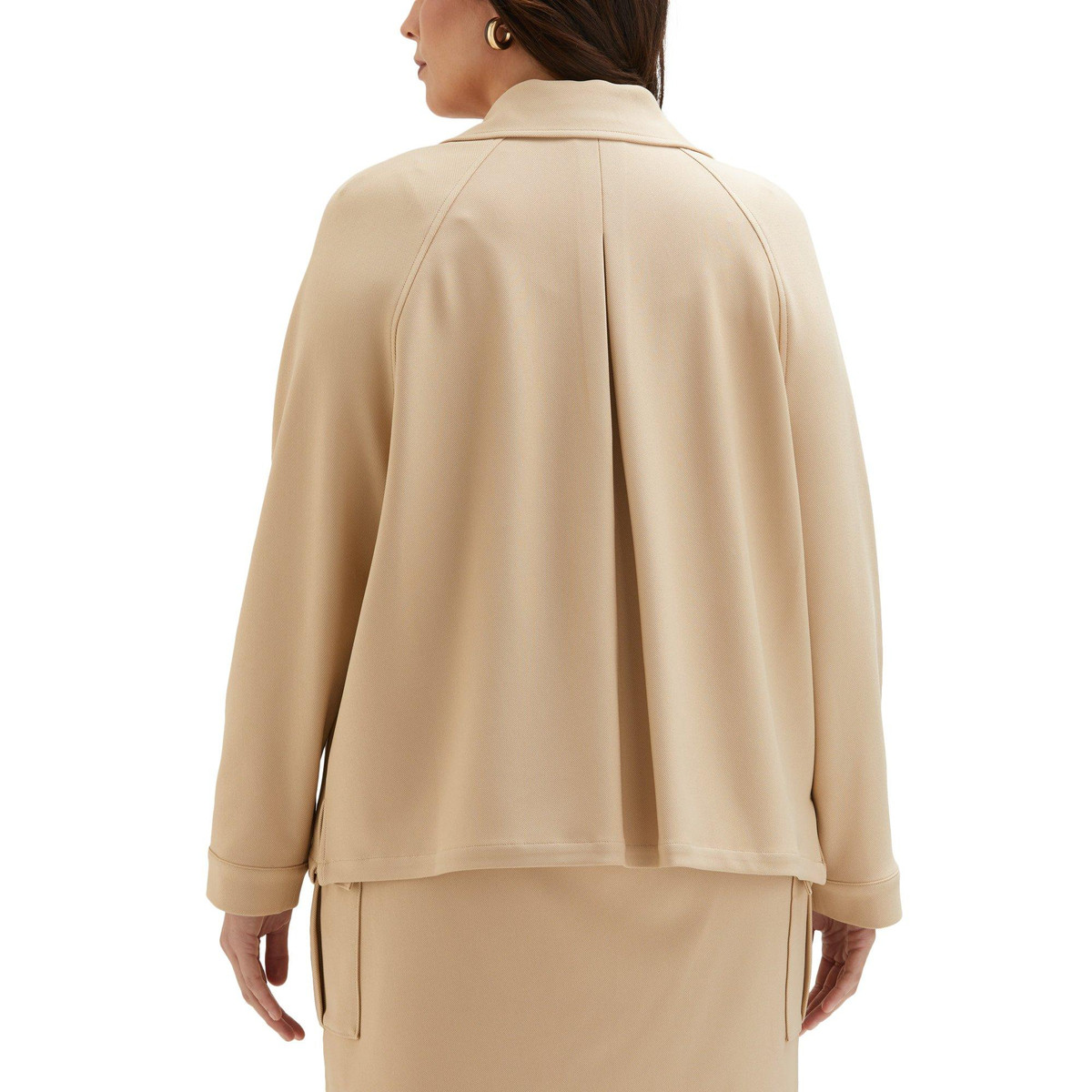 This light jacket features a flattering modern fit, and its enhanced with stretch to let you bend and reach comfortably. Flap-closed patch pockets provide a convenient place to store essential items while youre out on the town, while side slits at the hem add a little extra freedom of motion. Raglan sleeves give the design a relaxed look perfect for casual outings. Fabrication is 96% polyester, 4% spandex. Length measures approximately 27.5 in.