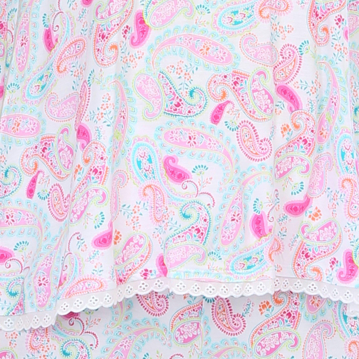 Sleep comfortably in this 2-piece sleep set featuring a print pattern on soft lightweight knit fabric, a scoop neck flutter sleeve top with eyelet lace hemline trim, and pull-on drawstring elastic waist capris. The top length measures approximately 26 in. The inseam measures approximately 23 in. Fabrication 95% rayon, 5% spandex.