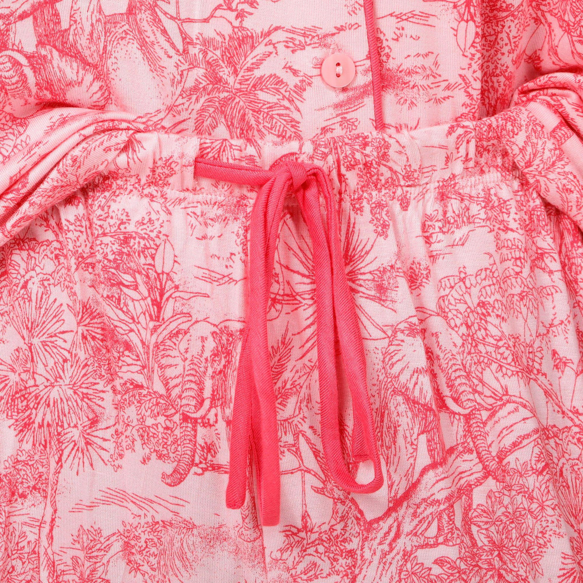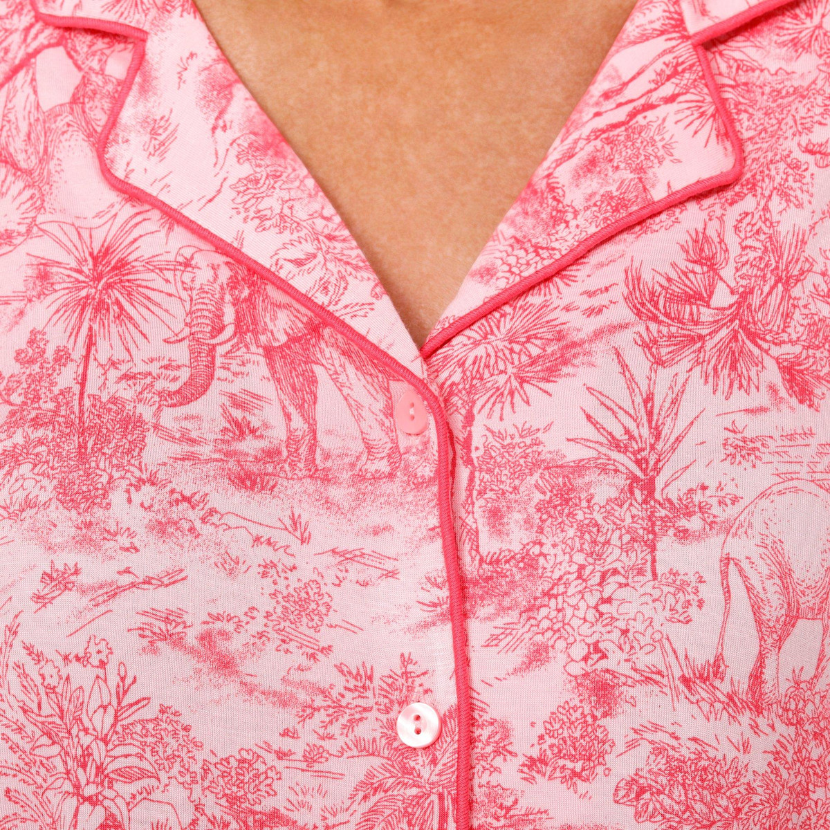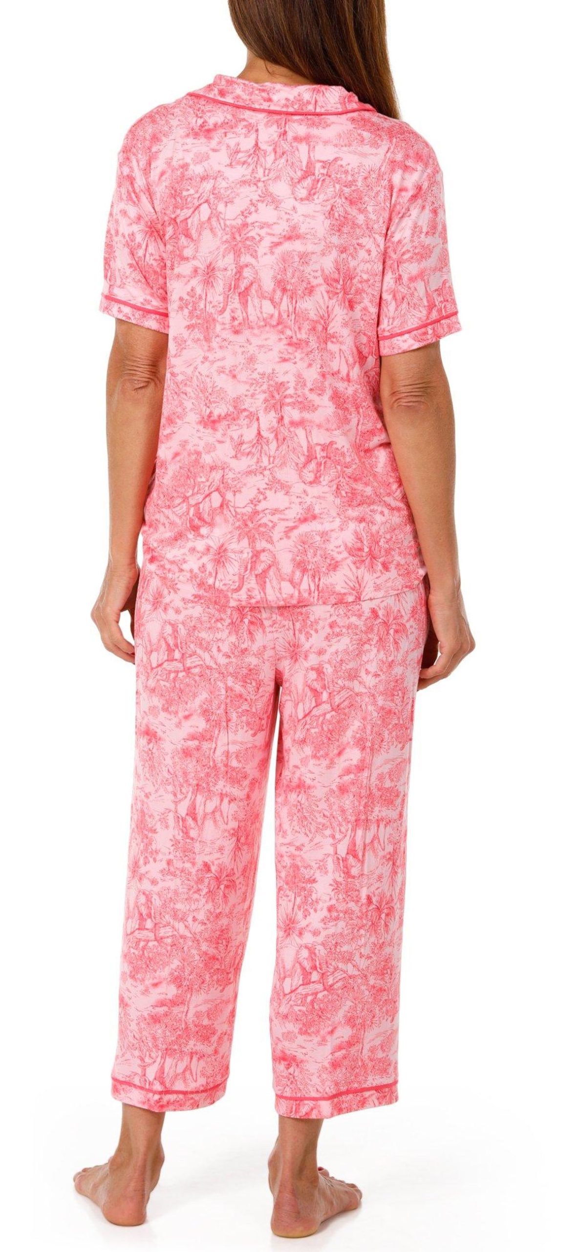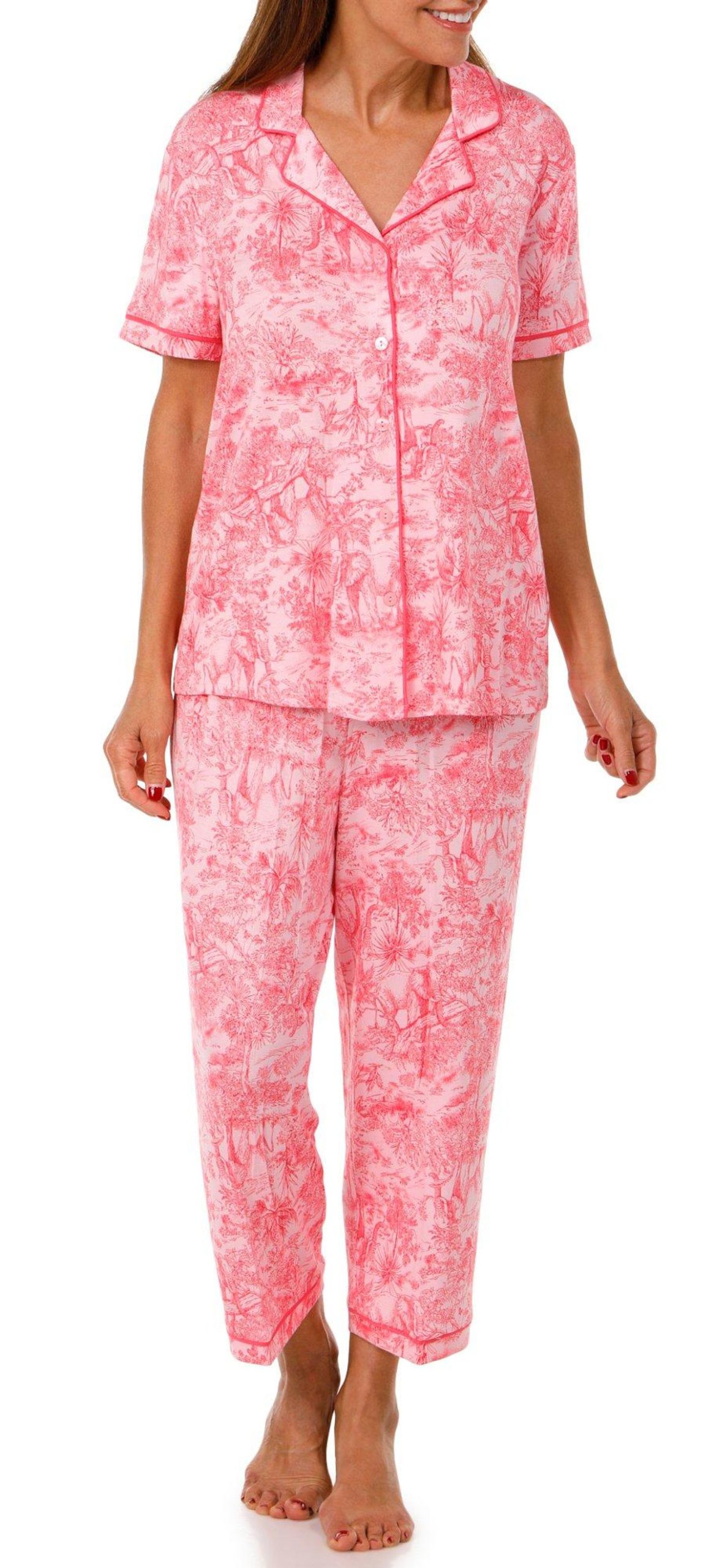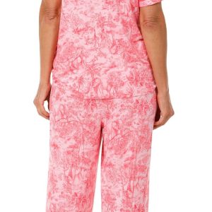 Drift into island dreams with this Women’s 2 Pc Tropical Print Sleepwear Set. Featuring a breezy short sleeve button-down top and matching capri pants, the vibrant tropical print brings vacation vibes to your bedtime routine. Stylish, soft, and perfect for warm nights.