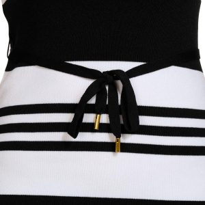 Step into style with our Women’s Short Sleeve Striped Sweater Dress. Made from a blend of polyester and viscose, this dress features a chic striped pattern and a flattering v-neckline. The short sleeves and waist tie add a touch of elegance, making it perfect for any occasion. Whether you’re heading to a casual outing or a special event, this sweater dress combines comfort and sophistication effortlessly. 45 inch length.