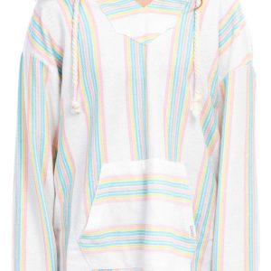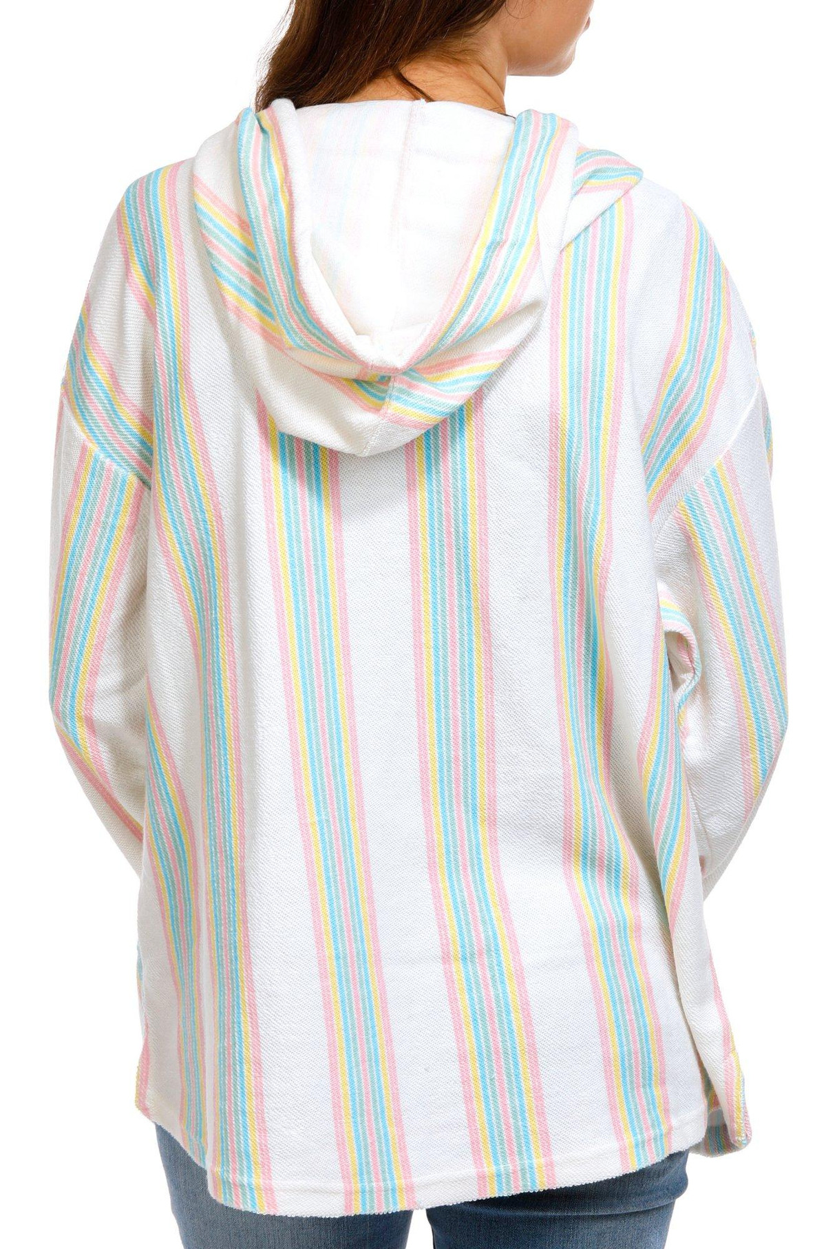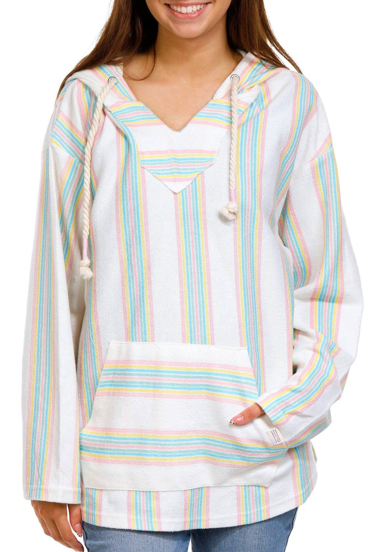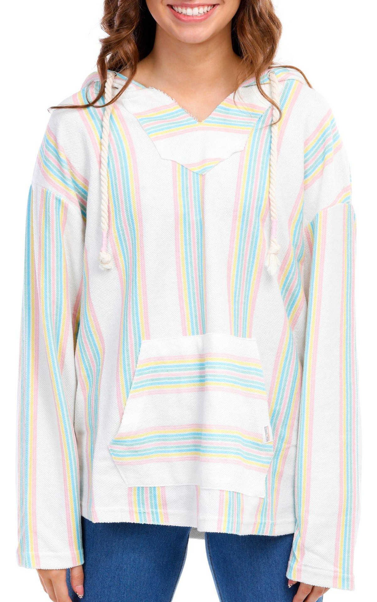 Introducing the Juniors Baja Stripe Hoodie, a perfect blend of cotton and polyester for comfort and durability. This hoodie features a stylish pastel striped print that adds a pop of color to any outfit. The drawstring hooded neckline provides adjustable coverage, while the kangaroo pocket offers convenience and warmth. With its long sleeves, this hoodie is ideal for layering or wearing on its own, making it a versatile addition to any wardrobe.