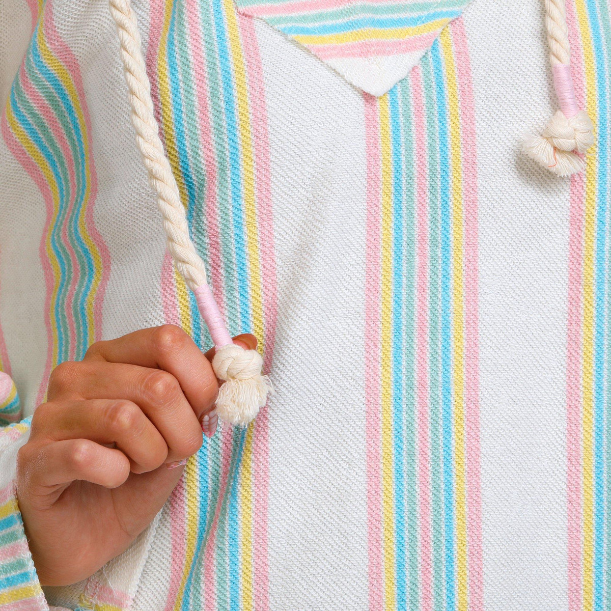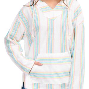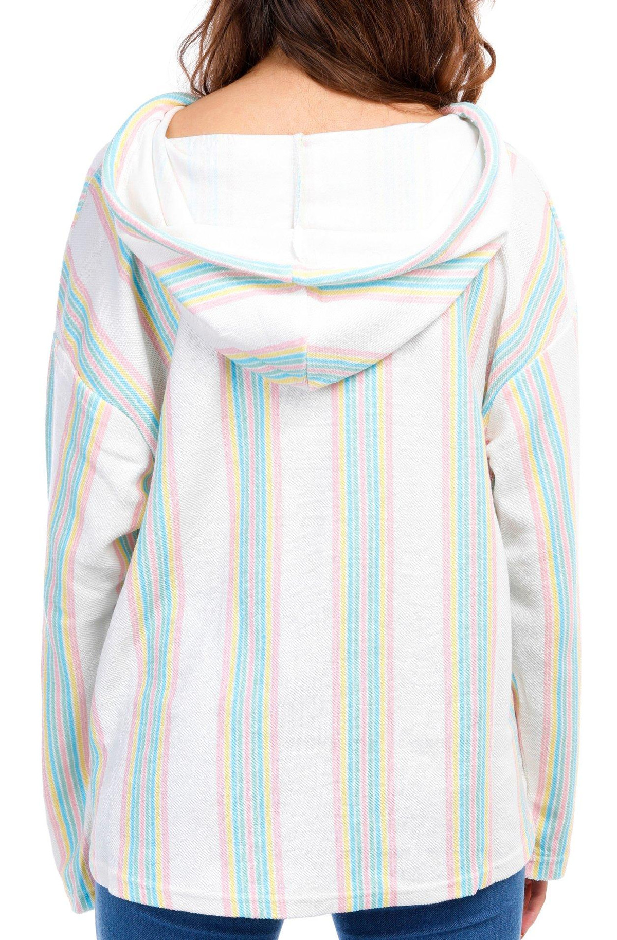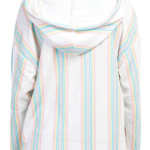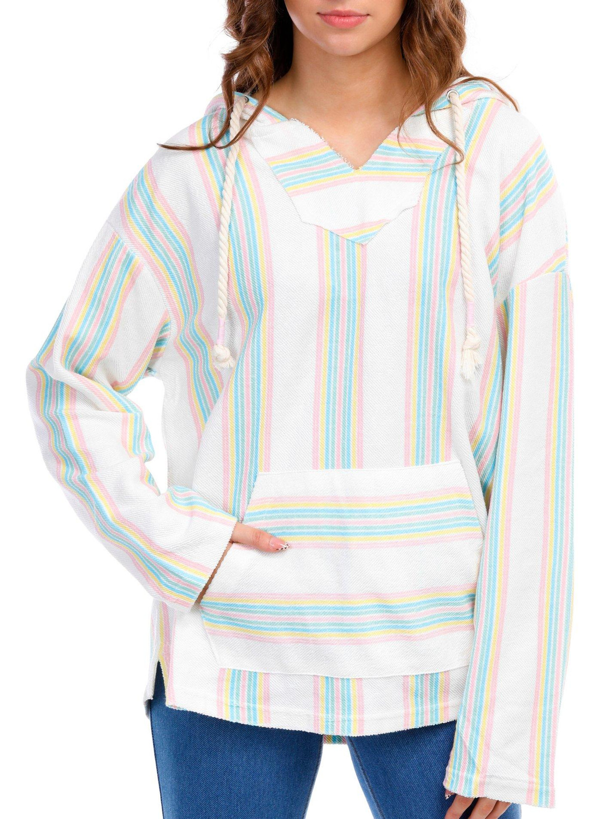 Introducing the Juniors Baja Stripe Hoodie, a perfect blend of cotton and polyester for comfort and durability. This hoodie features a stylish pastel striped print that adds a pop of color to any outfit. The drawstring hooded neckline provides adjustable coverage, while the kangaroo pocket offers convenience and warmth. With its long sleeves, this hoodie is ideal for layering or wearing on its own, making it a versatile addition to any wardrobe.