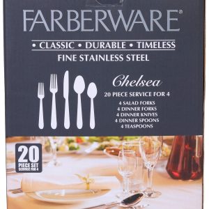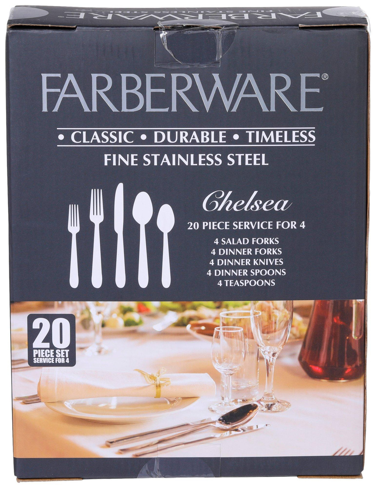 Bring timeless function to your table with the Farberware 20 Piece Stainless Steel Flatware Set, designed to serve 4. This complete set includes salad forks, dinner forks, dinner knives, dinner spoons, and teaspoonsall built for daily durability and polished style. Dishwasher safe and backed by a lifetime warranty, its a dependable choice for casual meals or special gatherings alike.