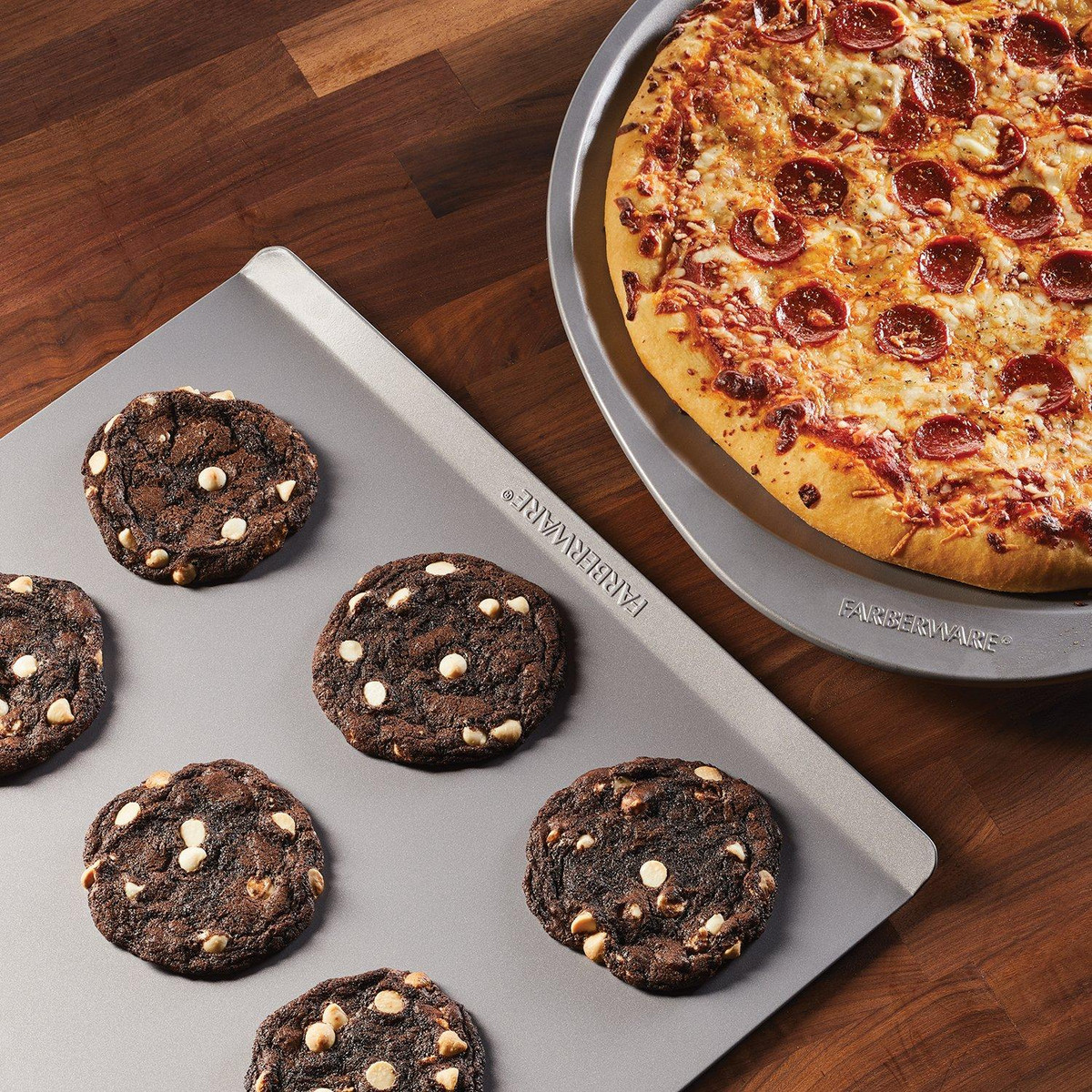 Farberware makes stylish, inventive cooking supplies for everyday use. This set of one baking sheet and one pizza pan features heavy gauge steel, baking pan features and insulated air pocket for airflow, and a perforated pizza pan. Measures 15.5Dia (pizza pan), 14W x 16L (baking sheet).