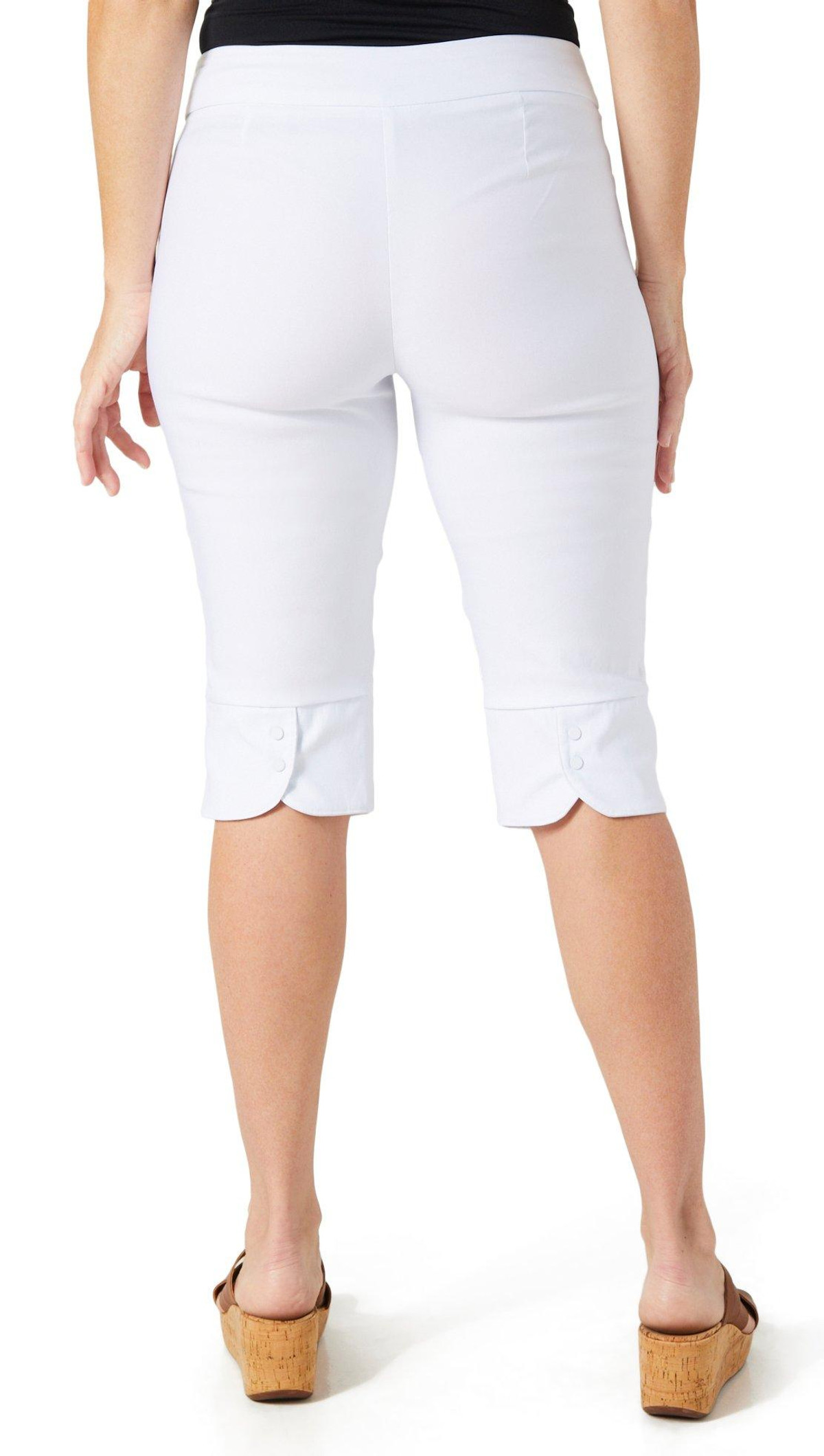 Stay polished and comfortable in these Petite Solid Double Snap Button Hem Capris. Made from a smooth, stretchy blend of nylon, rayon, and spandex, they feature a pull-on waistband, front pockets, a sleek solid color, and stylish snap button accents at the hemperfect for versatile, everyday wear.