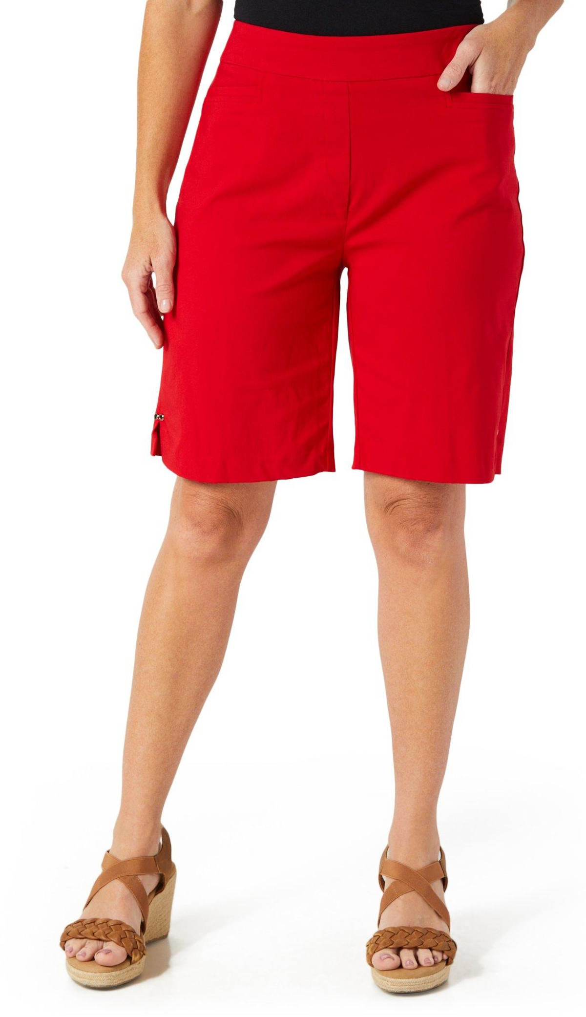 Upgrade your casual wardrobe with these Women’s 10 in Solid Stud Bermuda Shorts. Featuring a sleek solid color, pull-on waistband, front pockets, and chic stud accents at the hem, the 10-inch inseam offers a flattering, comfortable fit for everyday style.