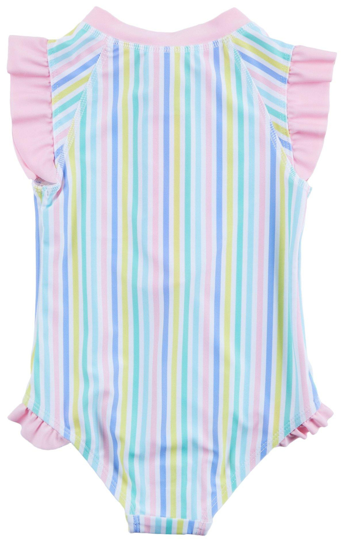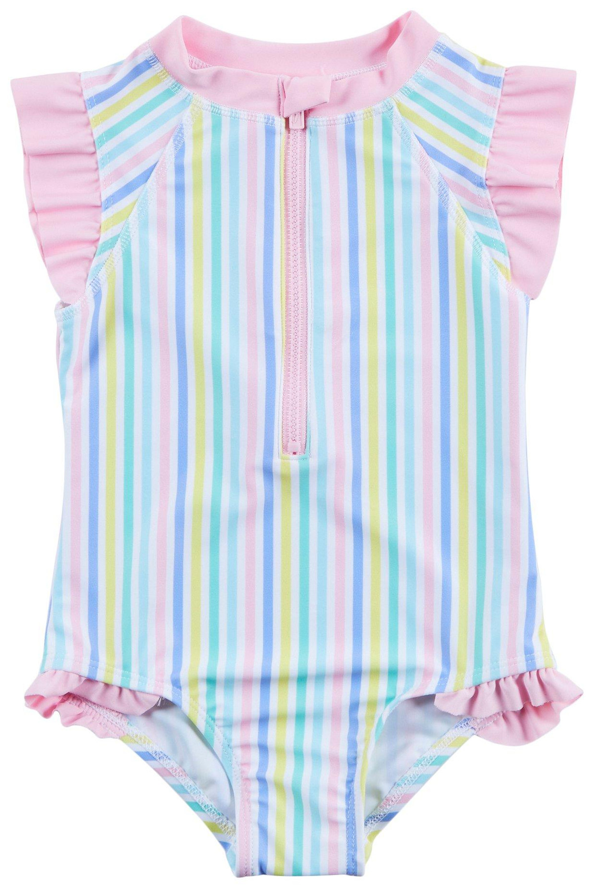 Introducing the Baby Girls Candy Stripe One Piece Swimsuit, made from a blend of polyester and spandex for a comfortable fit. This stylish swimsuit features a vibrant stripe print, a quarter zip collar, and short sleeves. With UPF 50+ protection, it ensures your little one stays safe from the sun while enjoying water activities. Perfect for beach days or poolside fun, this swimsuit combines fashion and functionality seamlessly.