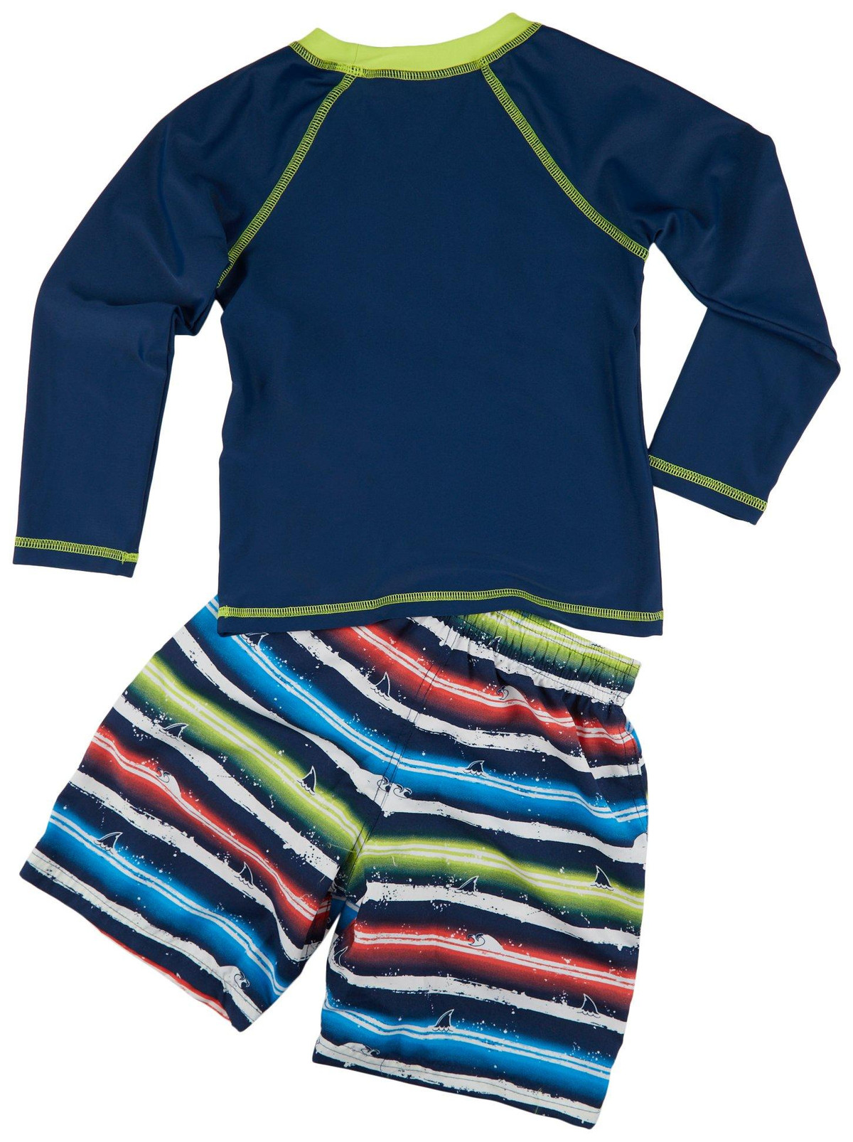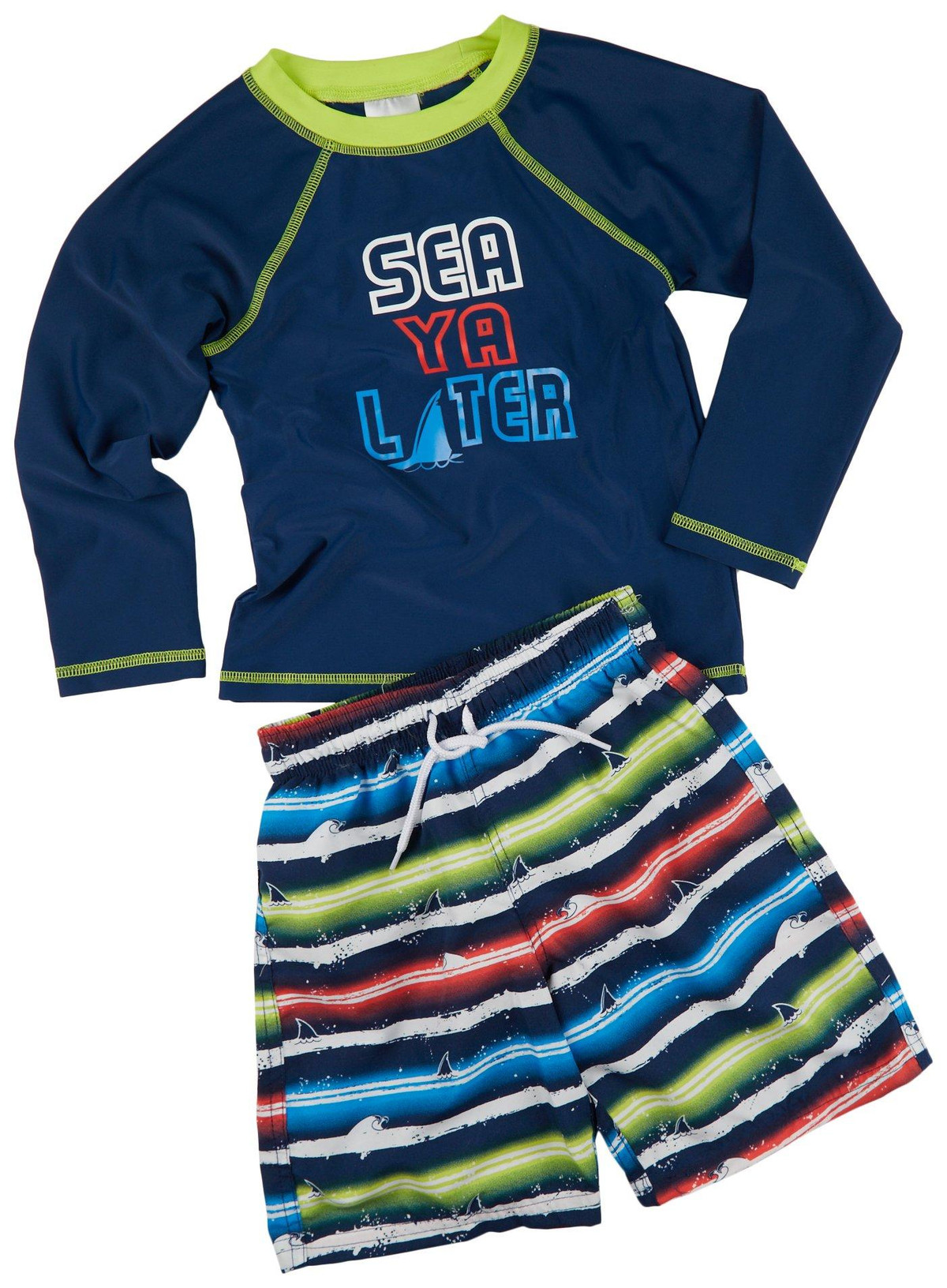 Introducing the Little Boys 2 Pc Swim Shorts Set, crafted from a blend of polyester and spandex for comfort and flexibility. This fun set includes a long sleeve rash guard featuring a playful Sea Y Later quote, paired with striped swim shorts. Perfect for beach days and poolside adventures, this set combines style and practicality. Elevate your little one’s swimwear collection with this vibrant and functional ensemble.