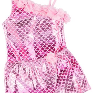 One-piece swimsuit with asymmetrical neckline and ombré foil mermaid scales printed at the front; comes with a matching cover-up skirt, designed for a comfortable and secure fit. Fabric Type: 86% polyester, 14% spandex