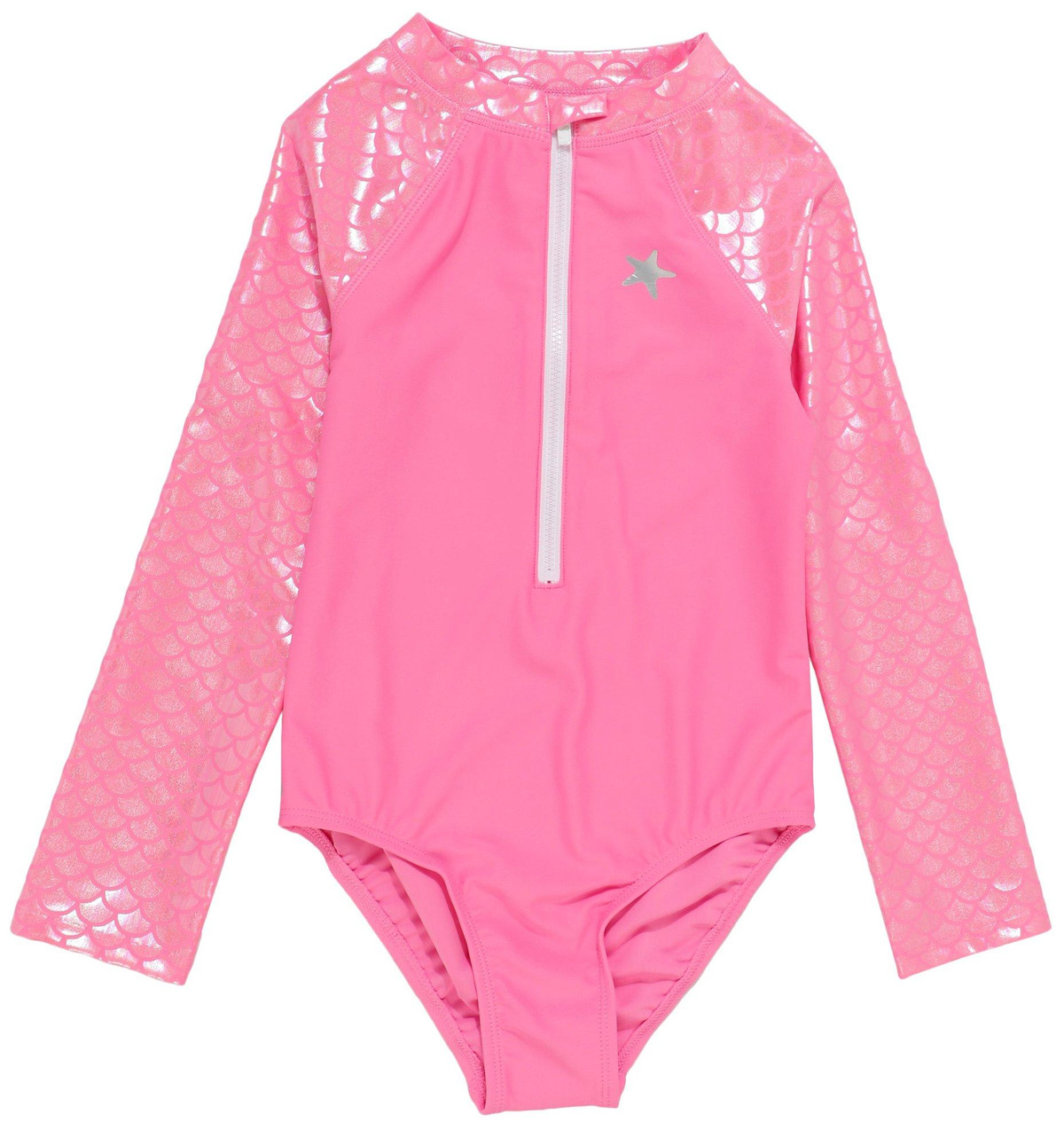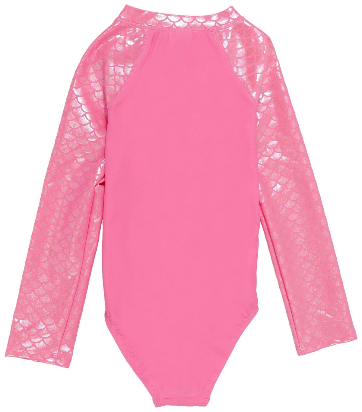 Introducing the Little Girls One Piece Mermaid Scale Long Sleeve Swimsuit, crafted from a blend of polyester and spandex for a comfortable fit. This adorable swimsuit features a cute foil mermaid scale design, a convenient zip-up front, and long sleeves. With UPF 50+ protection, it’s perfect for keeping your little one safe and stylish during sunny beach days or poolside adventures.