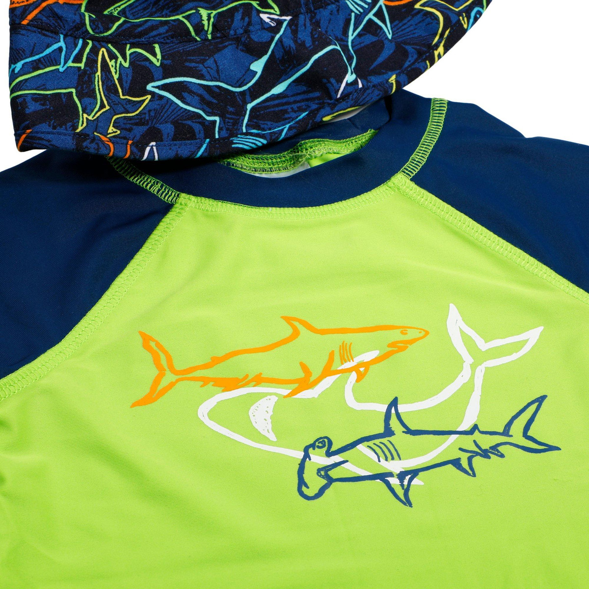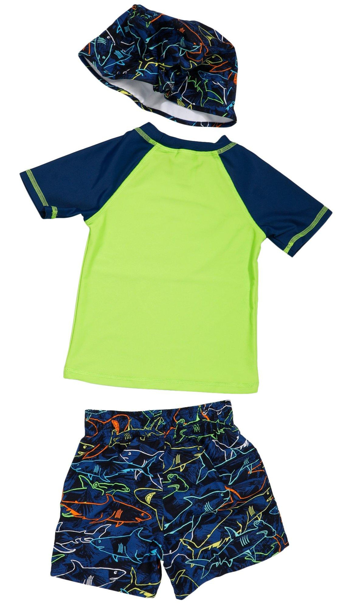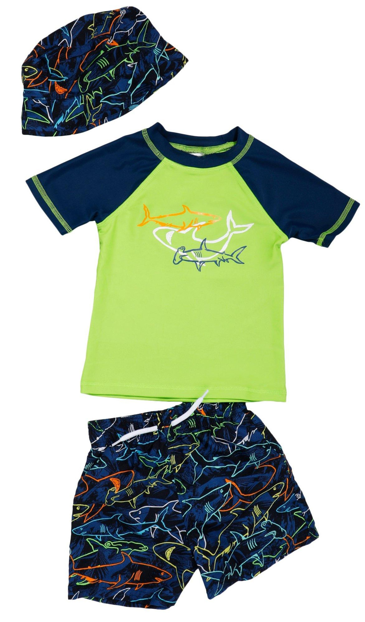 Introducing the Toddler Boys 3 Pc Swim Shorts Set, designed for ultimate sun protection and style. This set includes a short sleeve rash guard with UPF 50+ protection, ensuring your little one stays safe from harmful UV rays. The shark print swim shorts add a fun touch, while the matching hat completes the look, making it perfect for beach or pool adventures.
