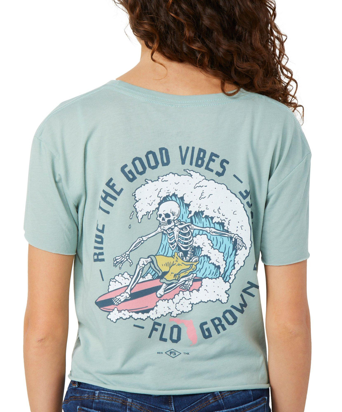 Ride the wave of style with the Juniors Ride The Good Vibes Graphic Tee. Featuring a classic crew neckline and short sleeves, this tee keeps it chill with subtle brand script on the front and a bold surfing skeleton graphic on the back. Fabrication 60% cotton, 40% polyester