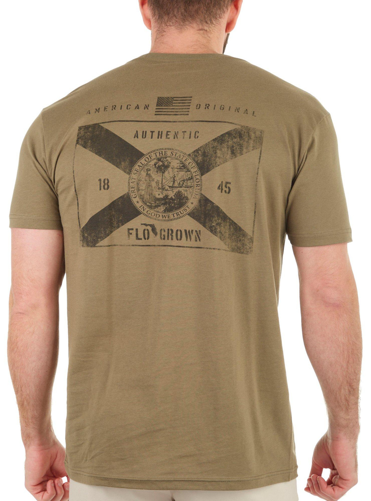Florida grown or not, celebrate the exciting Florida lifestyle with FloGrown apparel. This tee features a FloGrown print on the chest, and an authentic Florida state seal graphic on the back.