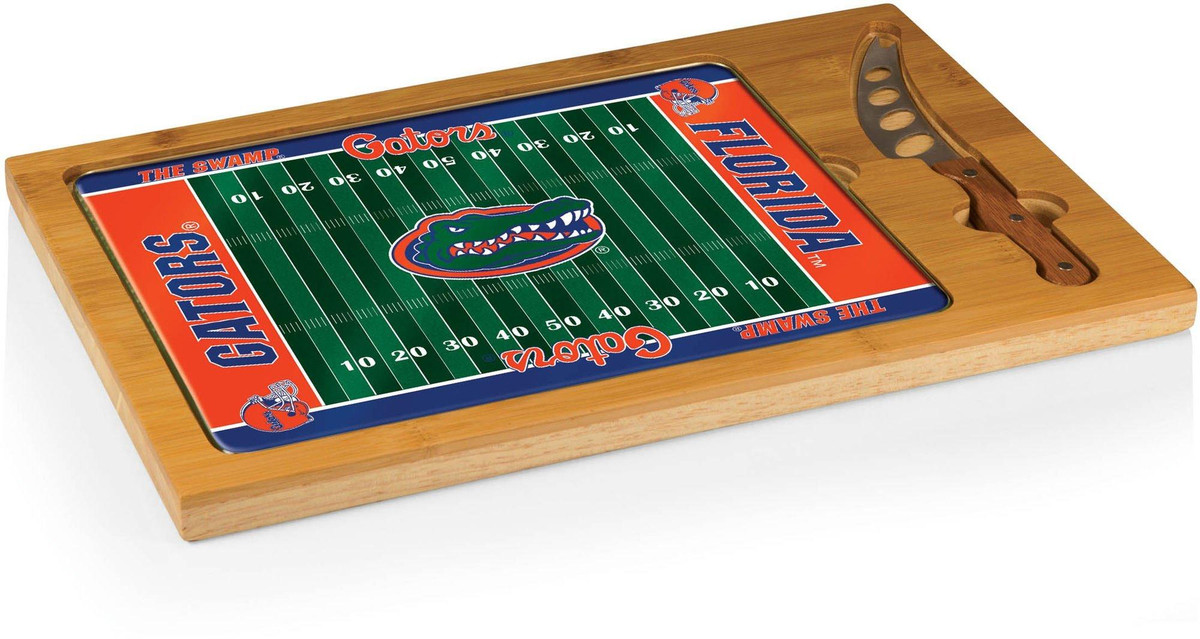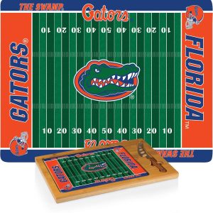 The Icon Florida Gators Cutting Board is a 3-pc. set that has a solid rubberwood base with a bamboo rim accent, a tempered glass lid, & a cheese knife with its own carved out area in the wood base. Measures 15.2”L x 10”W x .8”H.