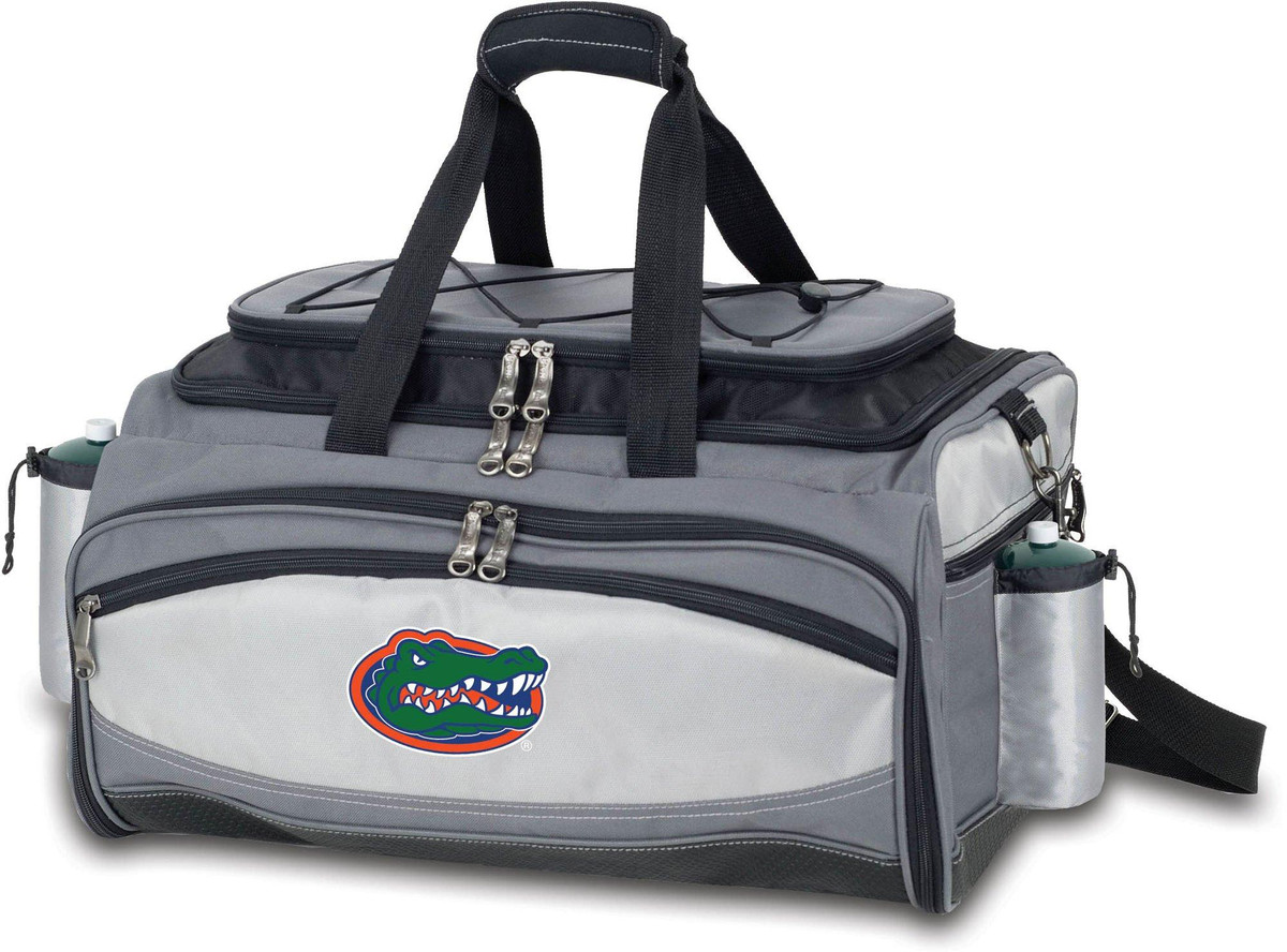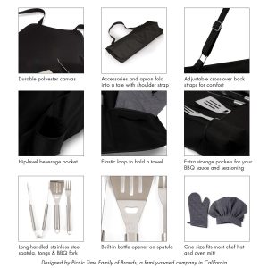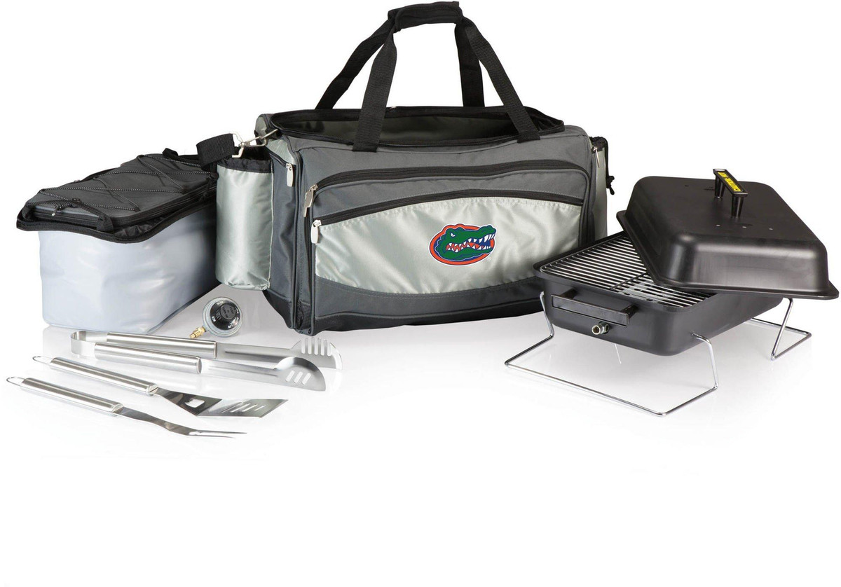 Tailgating set features cooler that measures 16” x 8” x 7” and holds 24 cans. Tote includes: portable LP (propane not included) grill with lid (16.7” x 10.8” x 5.1”), drawstring bag, spatula with bottle opener, grill scraper, and serrated edge, tongs, and BBQ fork.