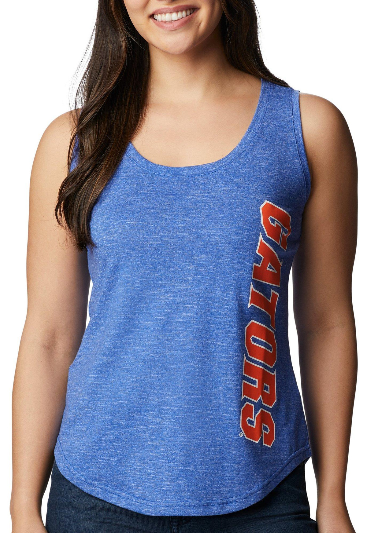 Support your favorite team in style in this tank top! It features a front Florida Gators screen print motif, a rear split hem, and a round neckline. Fabrication is 45% polyester, 30% cotton, 25% rayon. Top length measures 27 in. .