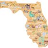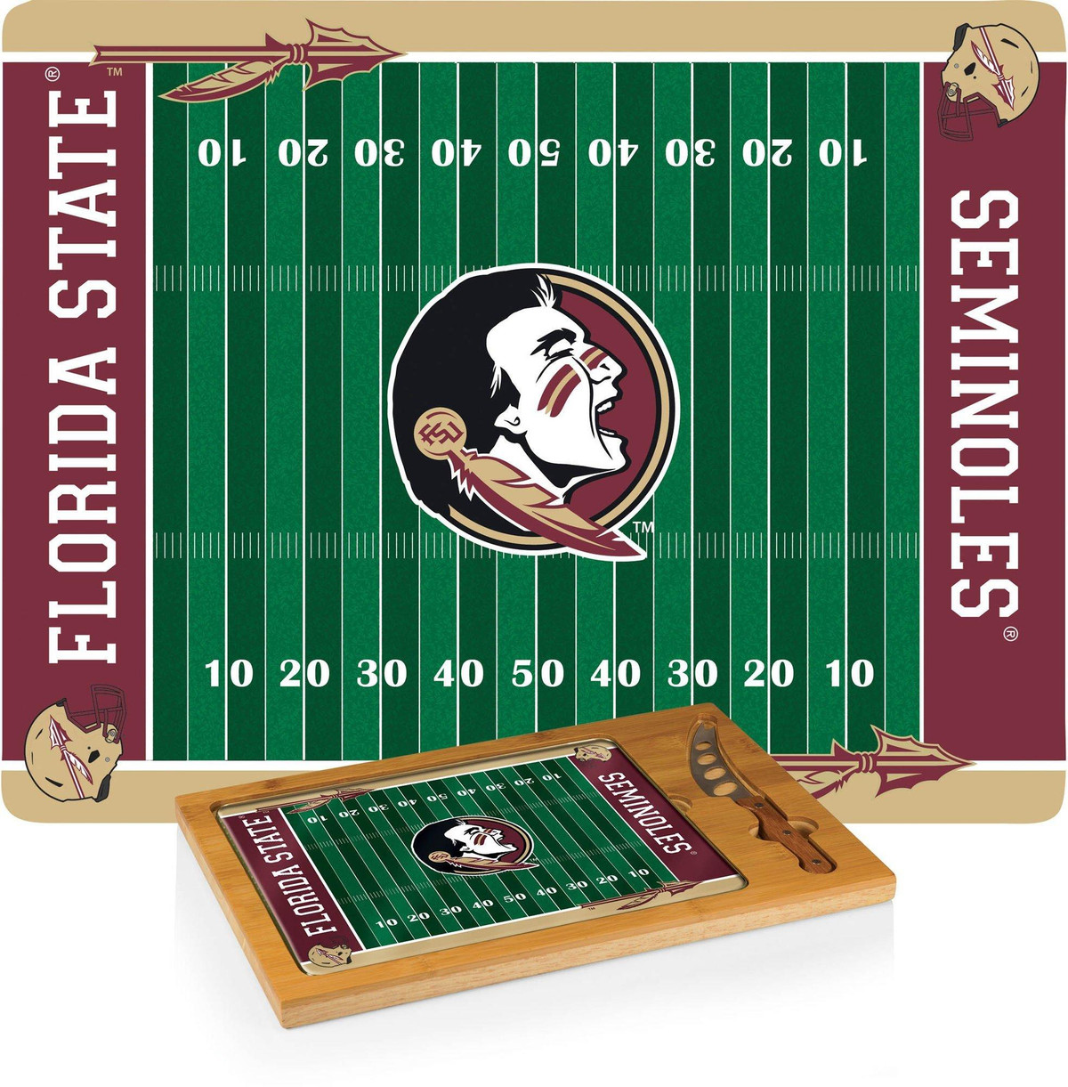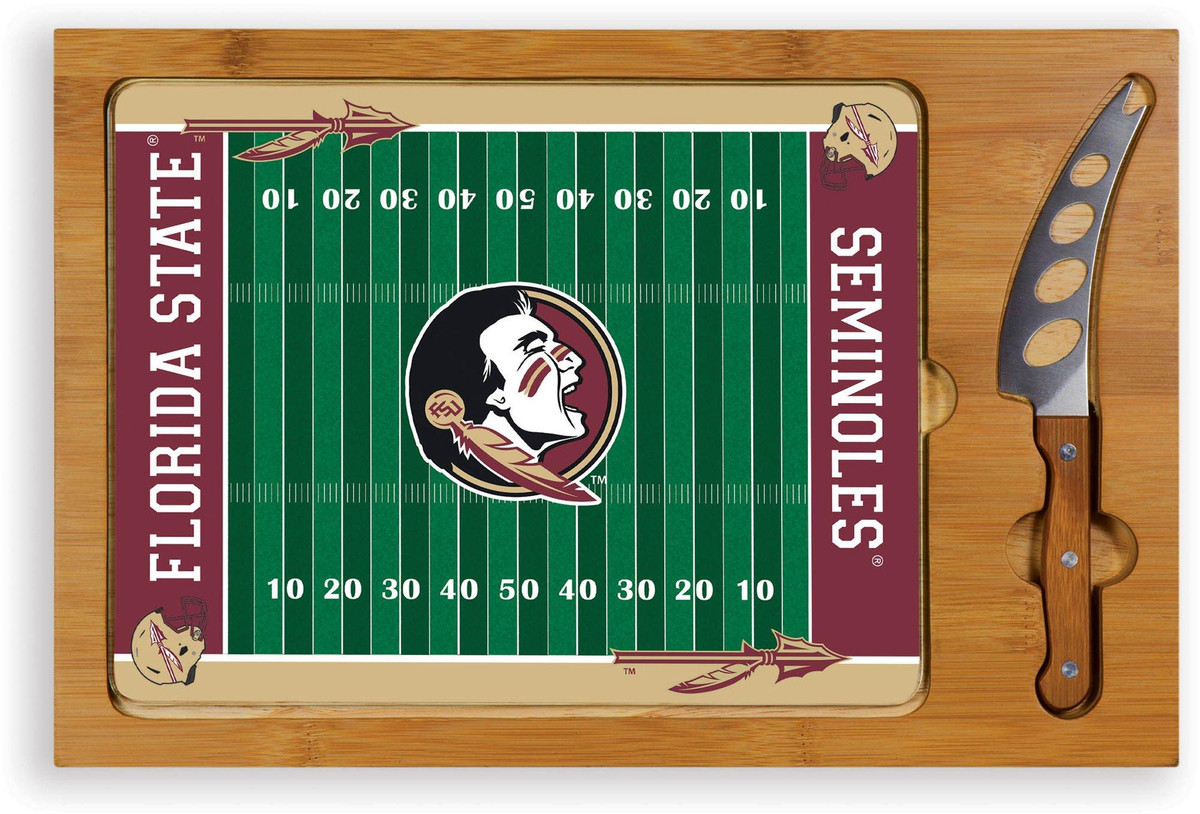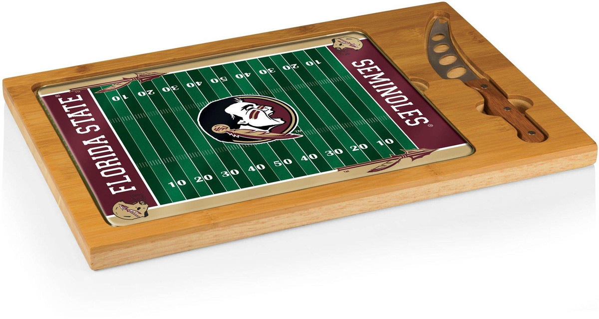 The Icon Florida State Seminoles Cutting Board is a 3-pc. set that has a solid rubberwood base with a bamboo rim accent, a tempered glass lid, & a cheese knife with its own carved out area in the wood base. Measures 15.2”L x 10”W x .8”H.