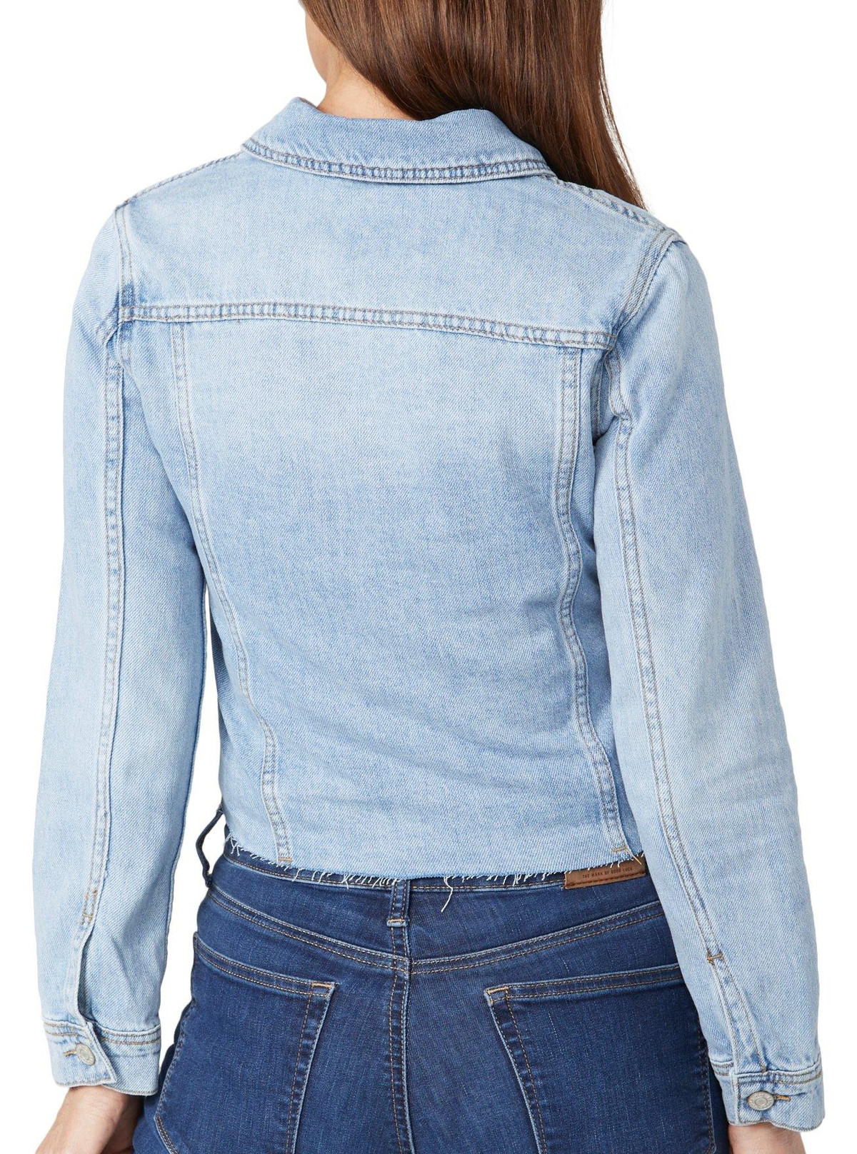 Elevate your style with our Petite Denim Jacket, crafted from a blend of cotton and rayon for ultimate comfort. This jacket features a light wash denim exterior, chest and side pockets for practicality, and a button-down front closure for a classic look. The collared neckline adds a touch of sophistication, while the frayed hem gives it a trendy edge. With an 18-inch length, it’s perfect for layering over your favorite outfits.