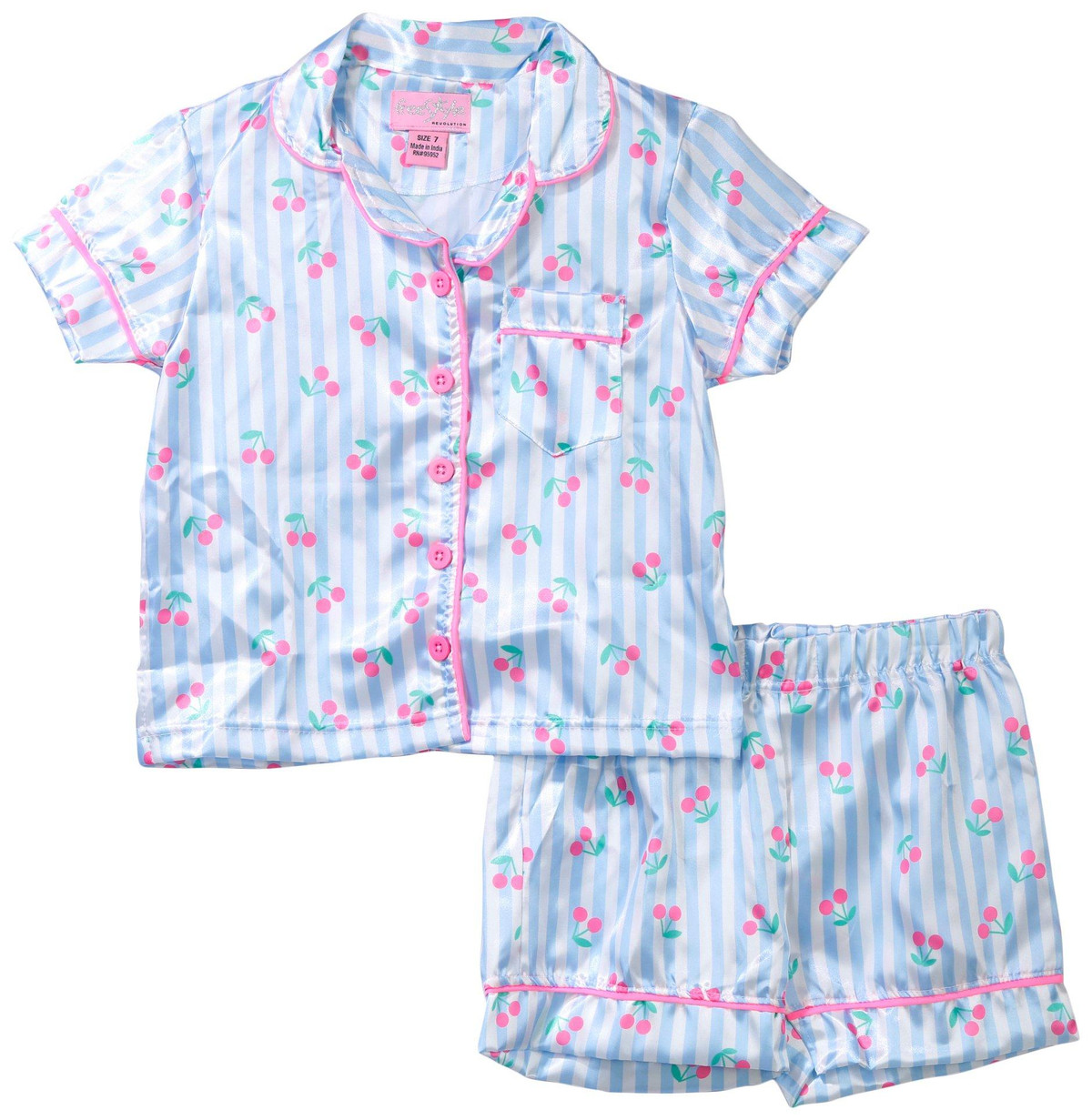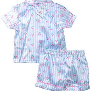 This big girls two-piece pajama set features a button-down collared shirt and matching shorts for a cozy fit. The blue striped design is adorned with a playful cherry pattern, while pink buttons and trim add a sweet touch. Made with flame-resistant fabric, it keeps her safe while she sleeps in style and comfort.