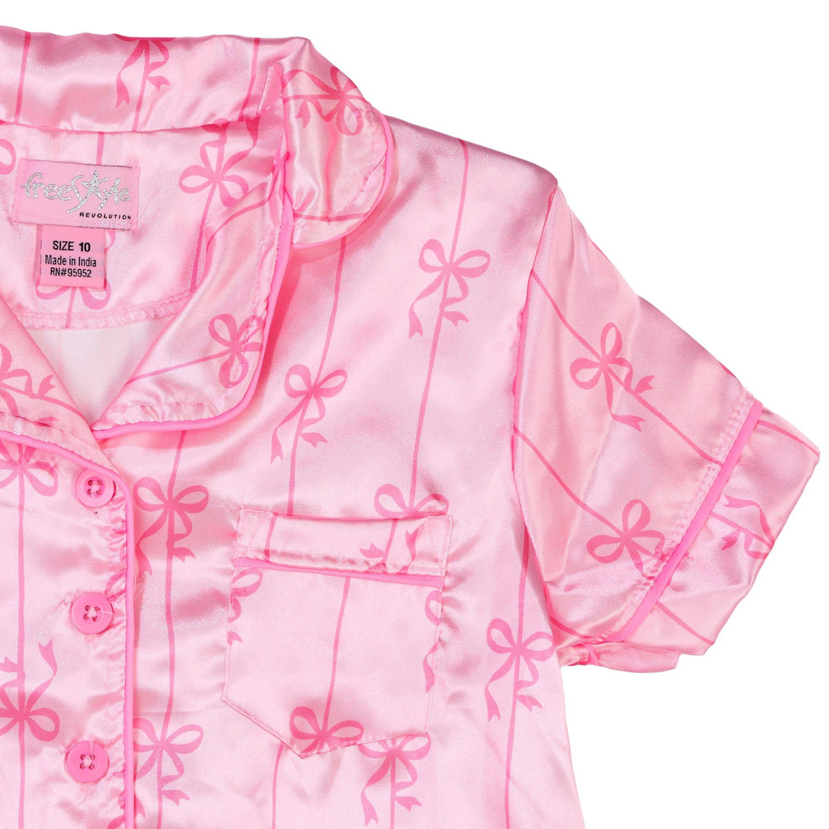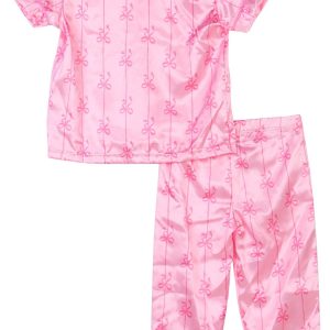 Pretty in pink, this two-piece pajama set adds a playful charm with its scattered bow design. The button-down top and matching pants offer a soft satin feel that makes bedtime extra cozy. Flame-resistant for peace of mind, this sleepwear is perfect for big girls who love a touch of sweetness in their nighttime style.