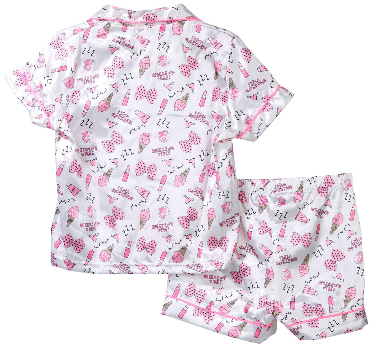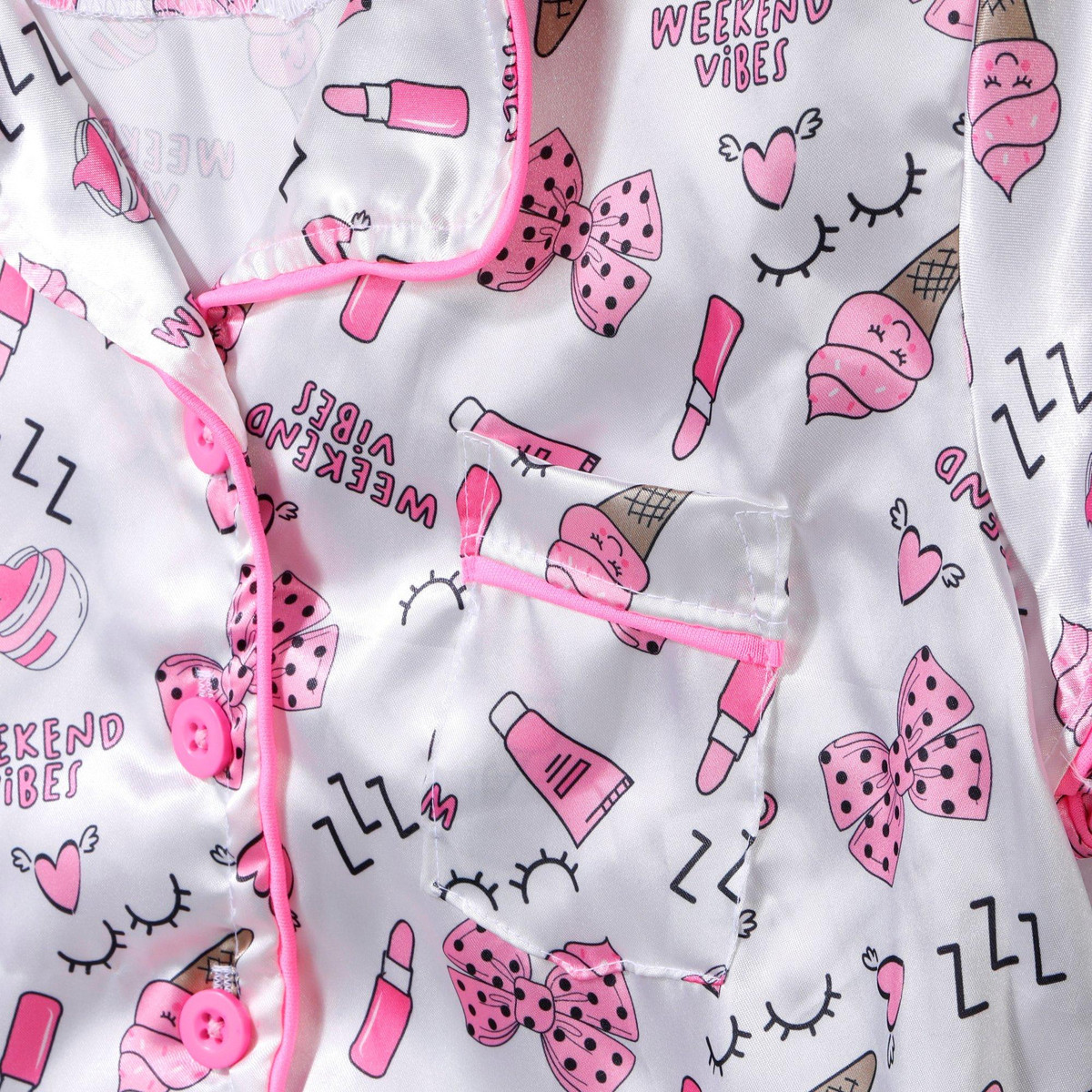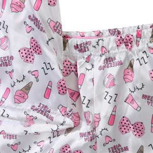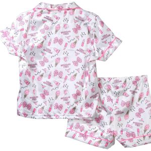 This big girls two-piece pajama set brings fun and comfort with a button-down collared shirt and matching shorts. The white fabric features a playful pattern of bows, lipstick, and weekend vibe prints for a stylish touch. Made with flame-resistant material, it keeps her safe while she sleeps in cozy style.