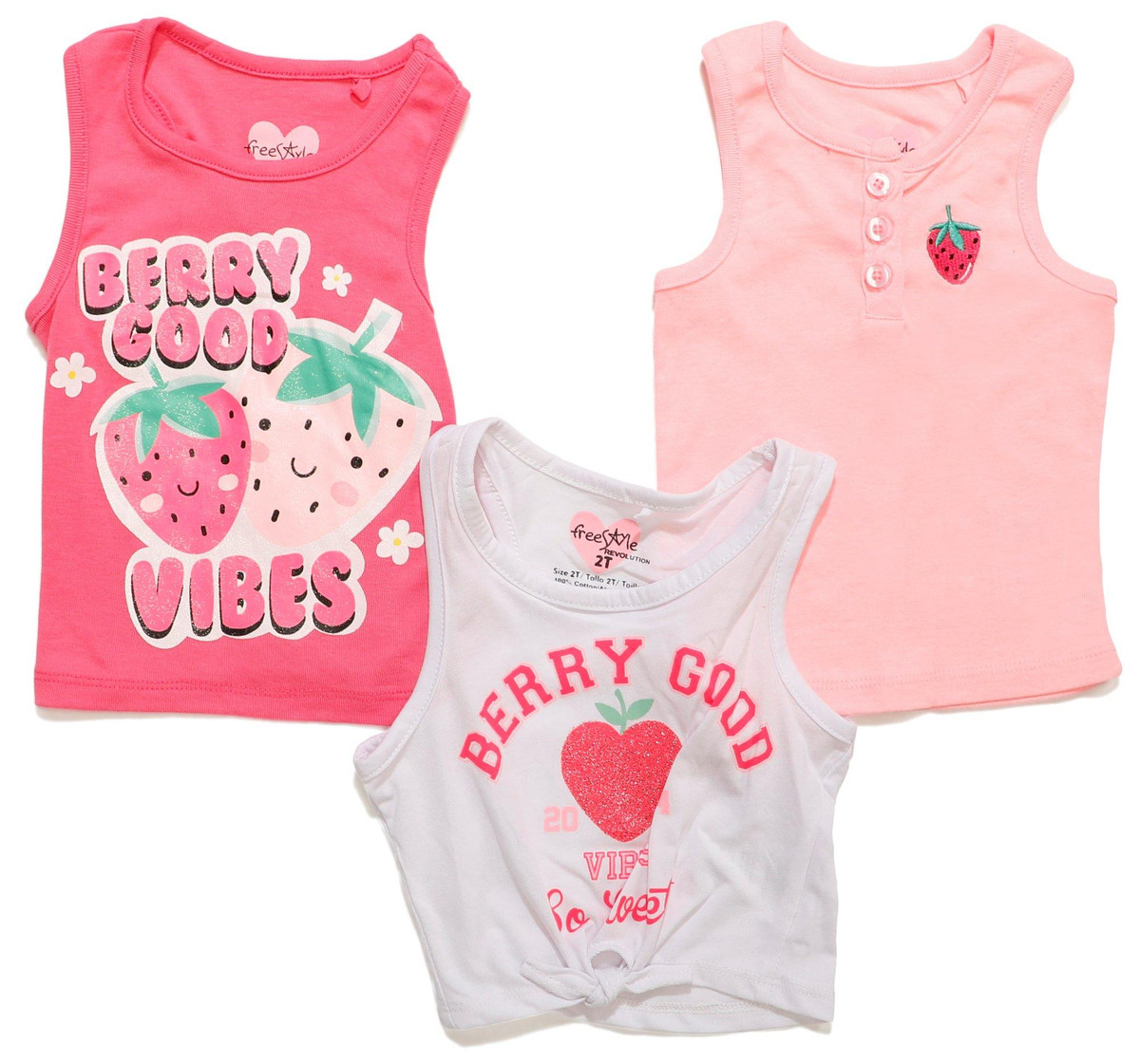 Brighten your little girl’s wardrobe with this 3-pack of sleeveless tanks in cheerful berry vibes. Made from 100% cotton, these tops are soft on delicate skin and breathable for all day play. With fun colors and easy layering, theyre perfect for warm weather or under a sweater. Moms will love the comfort, durability, and easy carebecause happy kids start with cozy clothes.