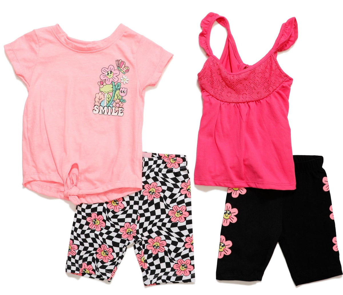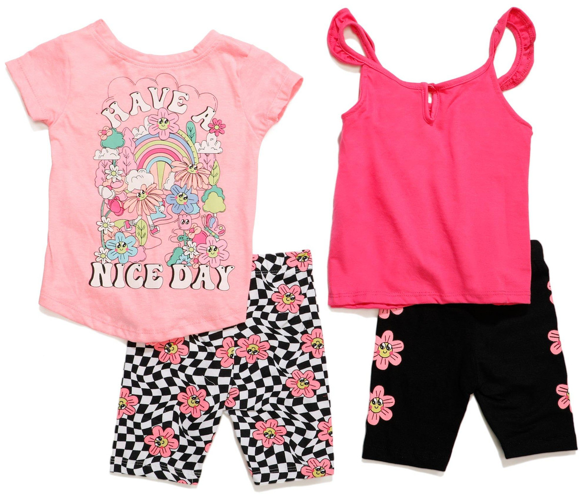 This adorable 4-piece set is perfect for the toddler girl whos always on the moveand the parent whos ready for anything. With one breezy sleeveless top and one cute crew neck short-sleeve tee, plus two pairs of comfy biker shorts, youll have endless mix-and-match options for warm days and active play. Made from 100% cotton, each piece is soft, breathable, and gentle on her skin. Keep a spare set in your bag for quick changes and effortless style wherever the day takes you.
