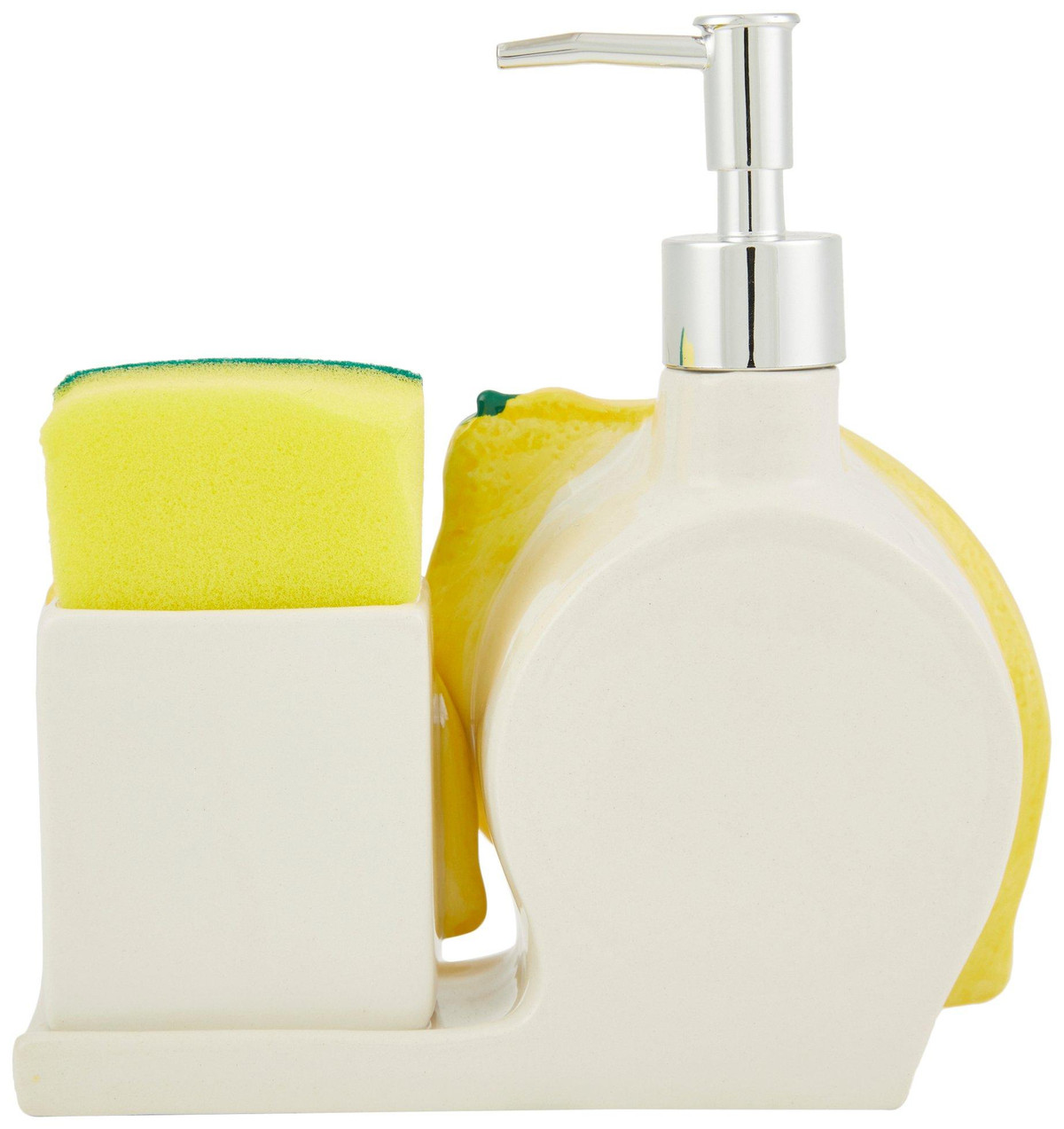 Brighten up any sink area with this soap pump and sponge holder from Fresh & Fruity. Designed with cheerful oversized lemons, this set adds a splash of fun while keeping things tidy. Includes a matching sponge that fits perfectly in the built in holder.