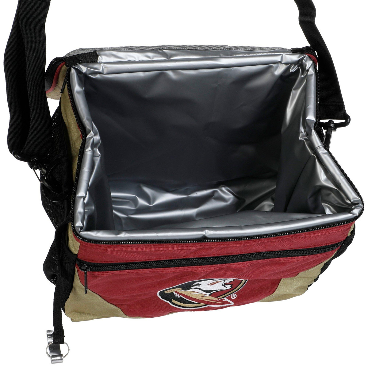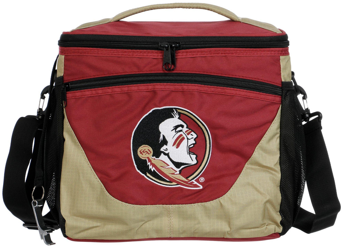 Keep refreshments cold with the Florida State Seminoles 24 Can Cooler. Built with a heat-sealed, leak-proof lining and featuring a comfortable shoulder strap, it offers space for up to 24 cans. Includes a front zip pocket, built-in bottle opener, and contrasting accents for added style. Ideal for tailgates, picnics, or outdoor gatherings. Wipe clean after use. Measures approximately 12 in x 8 in x 11 in.