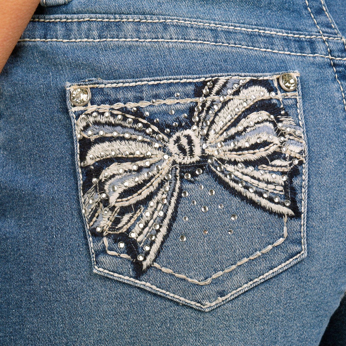 Elevate your casual style with the Juniors Bling Bows Denim Shorts! Made from a comfortable fabric blend, these shorts feature a secure button zip fly closure and a classic 5-pocket cut. The bling bows on the pockets add a trendy edge, while the distressed cuffs provide a laid-back, casual vibe. Perfect for any casual outing, these shorts are a must-have addition to your wardrobe! Fabrication is 68% Cotton, 30% Polyester, 2% Spandex. Length measures approximately 11 in.